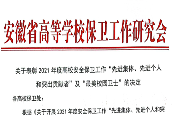 近日,安徽省高等学校保卫工作研究会印发了《关于表彰2021年度高校安全保卫工作“先进集体、先进个人和突出贡献者”及“最美校园卫士”的决定》,我校保卫处获评安徽省高等学校2021年度“先进集体”荣誉称号。
