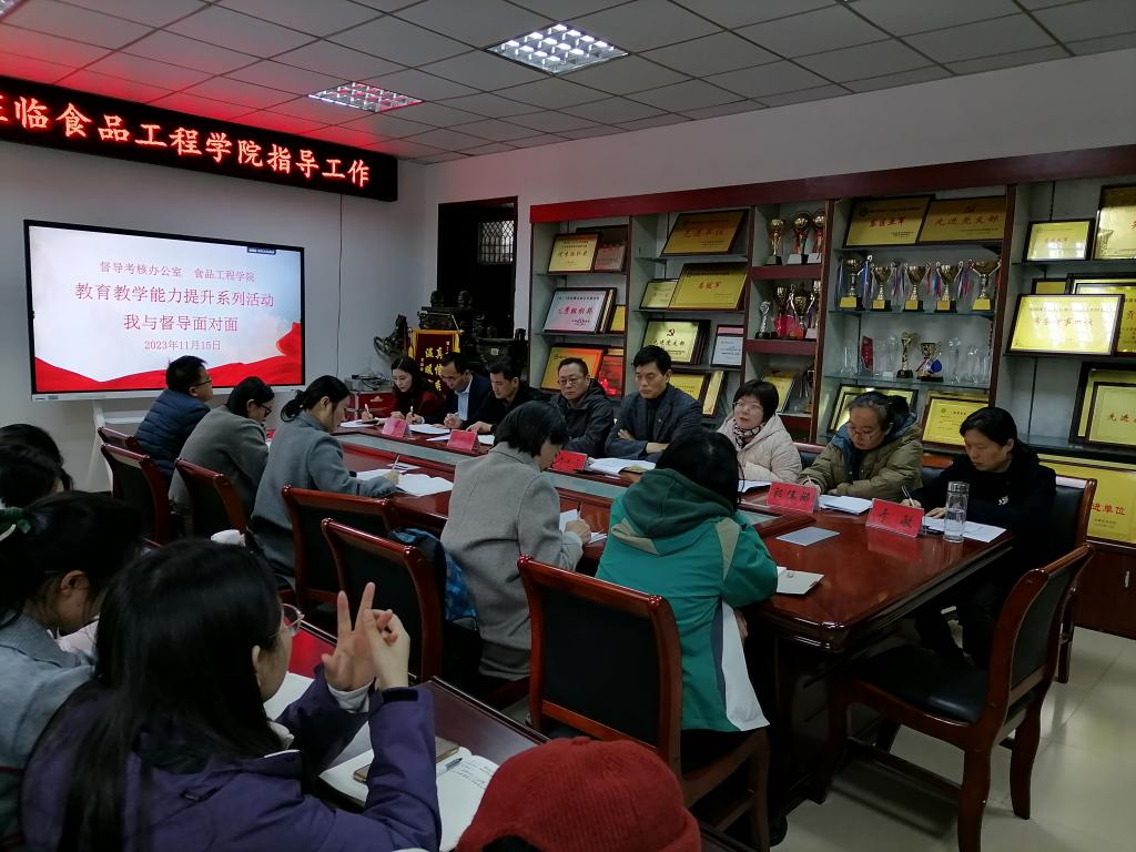 为提高青年教师教学能力,提升我校教学质量,加强教风、学风建设,增强全体师生的质量意识,促进学校育人工作高质量发展。1115日,督导考核办公室在食品工程学院会议室东办公楼104举行了以以学生为中心,增强质量意识--我与校督导面对面为主题的教育教学能力提升活动。食品工程学院党政领导、督导考核办公室工作人员、校督导代表和食品工程学院教师参加了活动。会议由食品工程学院党委副书记王广良主持。