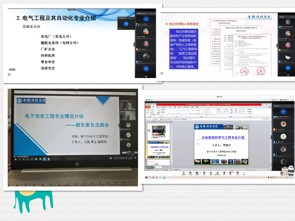 为促进家长和2020级新生更加深入了解大学学习和生活,实现“家+校”零距离沟通,9月15日下午,电气与电子工程学院组织召开2020级新生线上家长会。院长章毛连、党总支副书记尚磊,院长助理国海教授,青年教师代表樊晓宇博士、王磊博士、电气工程教研室主任周小杰及新生辅导员韩新风、张深、洪乃羽等出席会议。