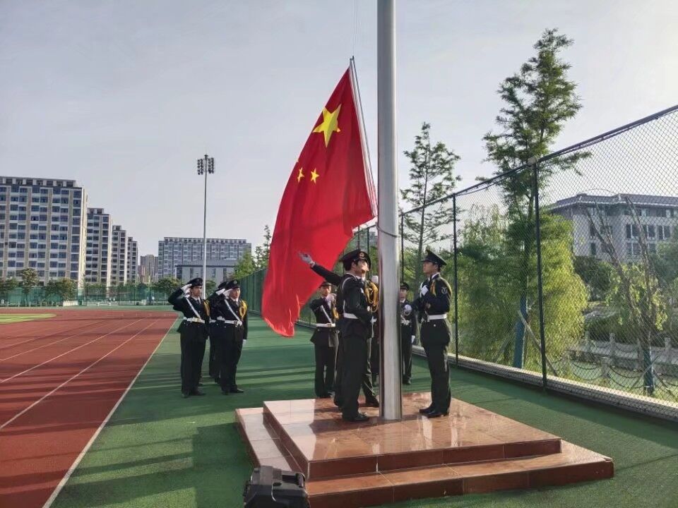 6时40分,国旗班的旗手们着装整齐,迈着矫健的步伐,护着鲜艳的五星红旗入场举行升旗仪式。伴着《义勇军进行曲》的响起,五星红旗冉冉升起,全体成员行注目礼,庄严肃穆。