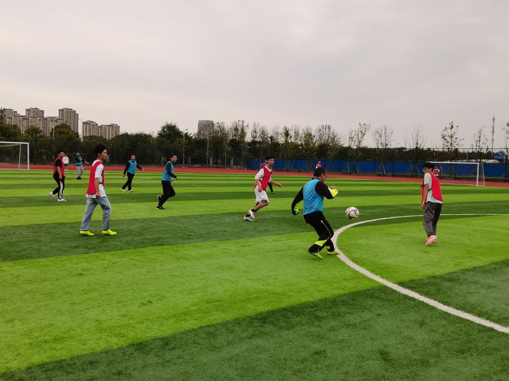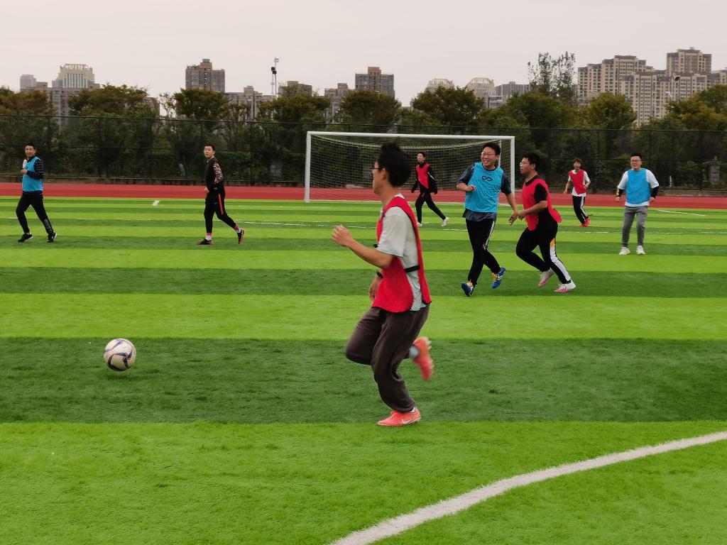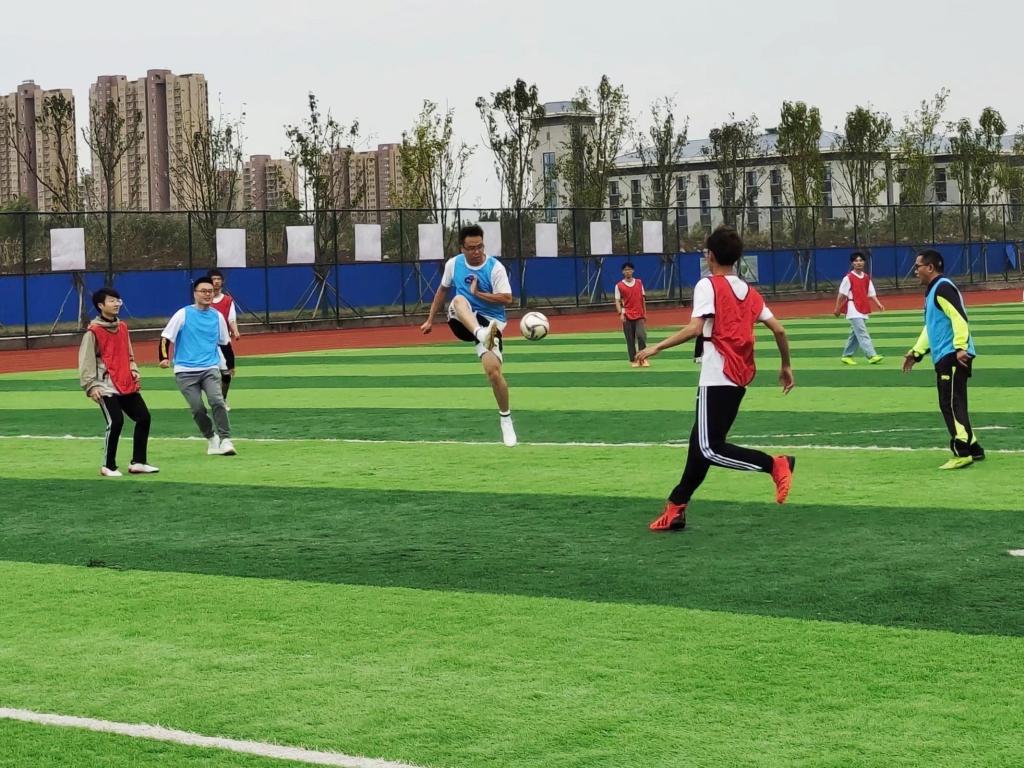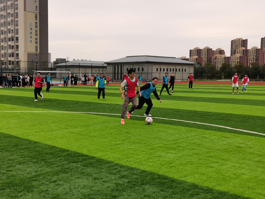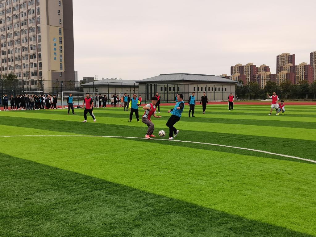 在进行了简短的开赛仪式后,随着一声哨响,骆海邦为正式比赛开球,掀开了比赛帷幕。教工队由夏显明担任队长,首发阵容由高伟霞、徐朝胜、李勇、王乐、徐兵、李恒新、李振国、陈更强、张深、洪乃羽、于宏亮等多位老师组成,学生队由电气与电子工程学院2021级新生组成。比赛分为两场,每场比赛30分钟。比赛的“战火”一触即发,由夏显明带领的教工组攻势不断,场外欢呼声此起彼伏。21级新生组青春激昂、富有活力、动作迅猛。经过紧张而又精彩的两场比赛,最终,教工组以4:3的成绩险胜这场比赛。