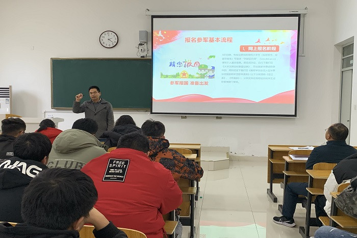 为做好学生应征入伍宣传动员工作,鼓励青年学生积极响应国家号召应征入伍,12月1日,电气与电子工程学院在致知楼B108举行“2023年入伍动员暨政策宣讲会”。学院党委副书记、纪委书记尚磊,党政办主任王延丽,团委书记张成孜,毕业班辅导员应邀出席,2019级部分毕业班学生参加了会议。