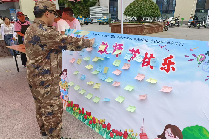 在活动现场,经过学生组织相关人员的耐心引导,在场同学们积极踊跃地参加活动,纷纷执笔写下了对老师们最诚挚的祝福。“教师节快乐”“老师您辛苦了”,寥寥几句,体现的是同学们尊师重教的情怀。满载同学们祝福的背景板,在校园内形成了一道亮丽的风景线。