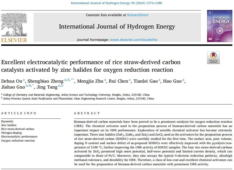 近日,我校新能源材料创新团队在材料类SCI二区top期刊International Journal of Hydrogen Energy(IF=7.20)发表题为“Excellent electrocatalytic performance of rice straw-derived carbon catalysts activated by zinc halides for oxygen reduction reaction”的研究论文。该论文的第一作者为我校化学与材料工程学院新能源材料与器件专业2021级本科生欧德华同学,通讯作者为指导教师过家好教授。