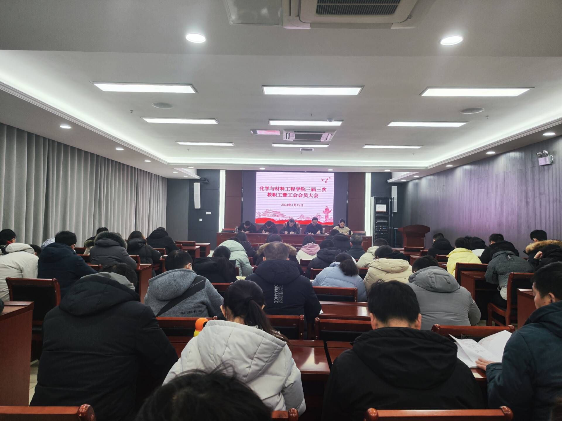 1月19日,化学与材料工程学院在西辅楼111会议室召开全体教职工会议,全体教职工参加了会议。会议由学院党委书记黄树桥主持。