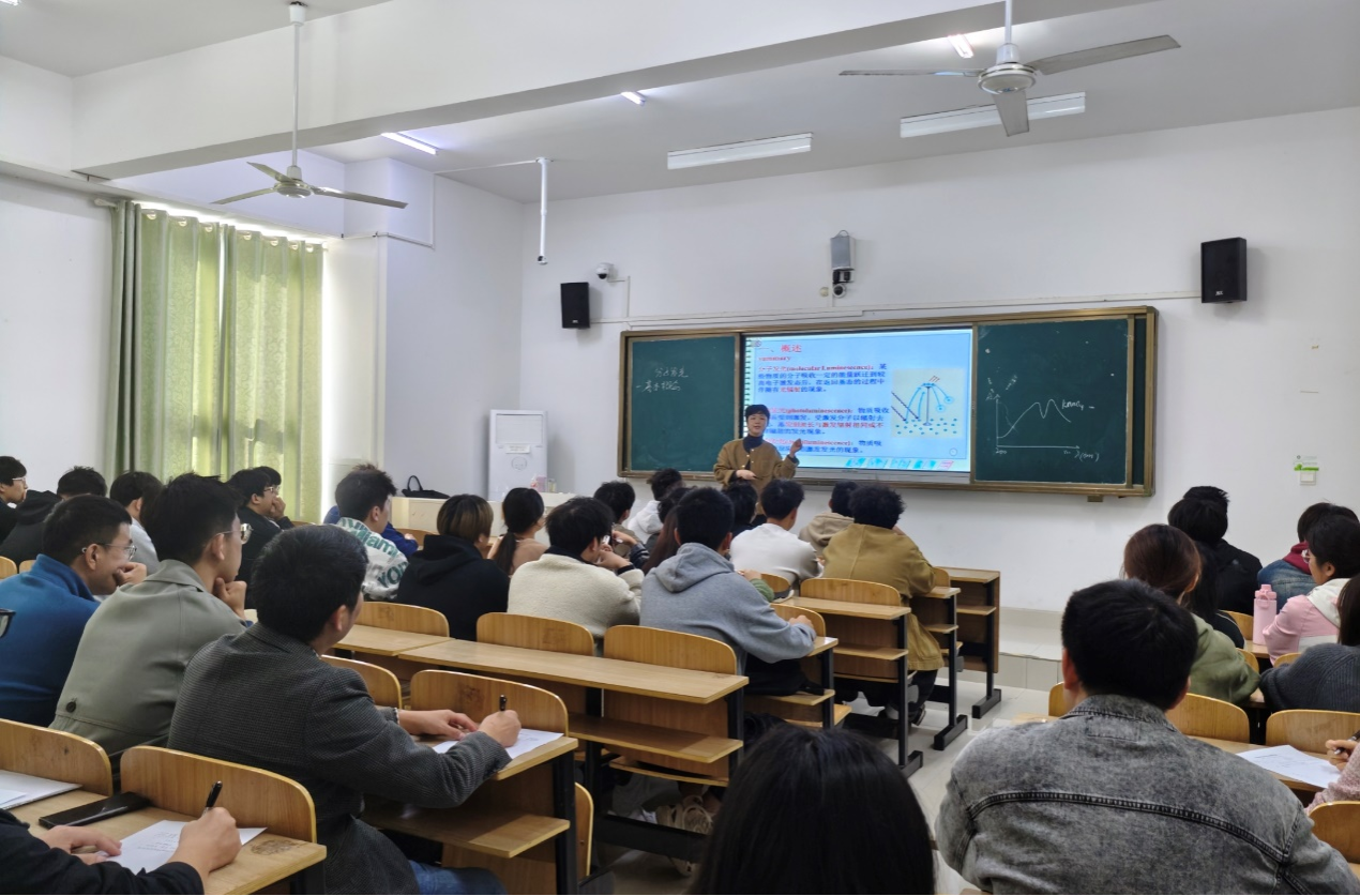 唐婧讲授的课程为《仪器分析》分子荧光与磷光章节,她用提问的方式,回顾了紫外可见光谱和红外光谱的相关知识,随后引出分子荧光和磷光的概念,以深入浅出的方式,详细讲解分子荧光和磷光的产生原理、光谱特性以及应用,用图示的方法将抽象的理论知识转化为直观、易懂的内容,使学生们对分子荧光与磷光有了更深入的理解。教学过程中,唐婧注重与学生的交流和互动,通过提问、比较、分析总结等方式,引导学生积极思考,有效提高了学生的课堂参与度和学习效果。课后,唐婧与参加观摩的教师进行了交流,教师们纷纷表示,唐教授教学风格亲切自然,授课准备充分,教学步骤设计合理,展现了深厚的专业知识和扎实的教学功底。