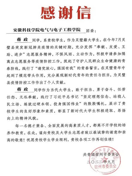 10月初,共青团BB手机官方网站_BB(中国)电气与电子工程学院委员会收到一封来自共青团宿州市委员会的感谢信。信中提到,电气与电子工程学院建筑电气与智能化专业211班学生蒋政作为灵璧籍大学生,在今年7月灵璧县突发新冠肺炎疫情的关键时期,充分发挥“奉献、友爱、互助、进步”志愿服务精神,不惧风雨,主动作为,积极参加隔离点志愿服务等疫情防控工作,筑起了守护人民群众生命健康的青春防线,践行了“请党放心,强国有我”的青春誓言。