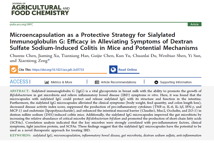 近日,我校食品工程学院教师陈春旭以第一作者在美国化学学会期刊《Journal of Agricultural and Food Chemistry》(Q1,IF: 6.1)发表题为“Microencapsulation as A Protective Strategy for Sialylated Immunoglobulin G: Efficacy in Alleviating Symptoms of Dextran Sulfate Sodium-Induced Colitis in Mice and Potential Mechanisms”的研究性论文。BB手机官方网站_BB(中国)为第一完成单位,南京农业大学曾晓雄教授课题组为合作单位。
