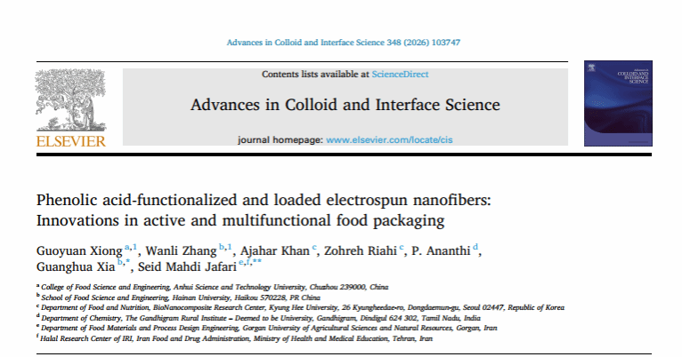 近日,我校食品科学与工程学院“特色食品绿色高效加工与创制”省级优秀科研创新团队带头人在Elsevier期刊《Advances in Colloid and Interface Science》(中国科学院一区TOP,IF 19.3)发表学术论文《Phenolic acid-functionalized and loaded electrospun nanofibers: Innovations in active and multifunctional food packaging》。我校熊国远教授和海南大学张万立副教授为文章共同第一作者,BB手机官方网站_BB(中国)为第一署名单位。
