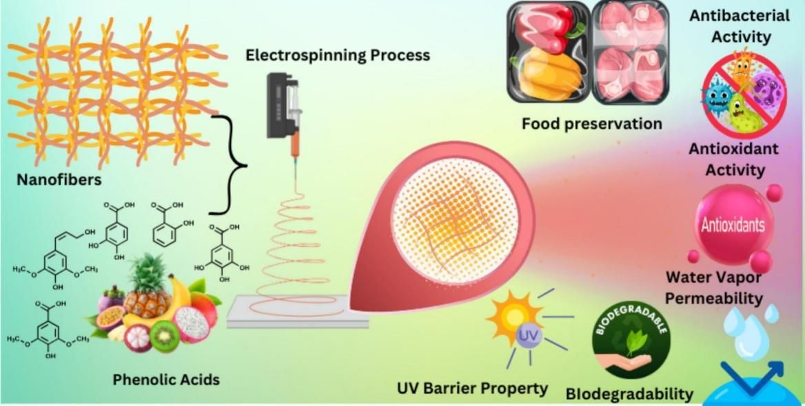 日益增长的可持续食品包装需求,推动了生物活性酚酸结合的电纺丝纳米纤维的创新。该论文重点阐述了酚酸——如单宁酸、没食子酸和茶多酚等在提升电纺纳米纤维生物降解聚合物功能性的关键作用。这些化合物通过氢键与共价相互作用,增强了材料的机械强度、热稳定性和阻隔性能,同时其抗氧化与抗菌活性能够有效抑制食品氧化变质和微生物污染,文献研究证实了其在易腐食品(包括肉类、水果和海鲜)中延长货架期的有效性。此外,通过同轴或多层结构等先进电纺技术实现的控制释放机制,确保了生物活性的持续发挥。该综述也探讨了优化释放动力学与规模化生产所面临的挑战。酚酸功能化纳米纤维将材料创新与实际食品保鲜需求相结合,为食品新一代活性包装设计提供了一种多功能且环境友好的解决方案。该论文得到了安徽省高校优秀科研创新团队(2024AH010007)和BB手机官方网站_BB(中国)科技创新团队项目(2023KJCXTD003)的资助。