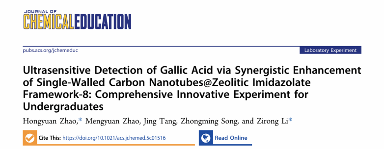 12月22日,美国化学会旗下化学教育国际顶级期刊《Journal of Chemical Education》在线发表了我校化学与材料工程学院的重要教学研究成果《Ultrasensitive Detection of Gallic Acid via Synergistic Enhancement of Single-Walled Carbon Nanotubes@Zeolitic Imidazolate Framework-8: Comprehensive Innovative Experiment for Undergraduates》。化工新材料灯塔团队成员赵红远副教授为论文第一作者,团队负责人李子荣教授担任通讯作者。我校是该教学研究成果的唯一完成单位。