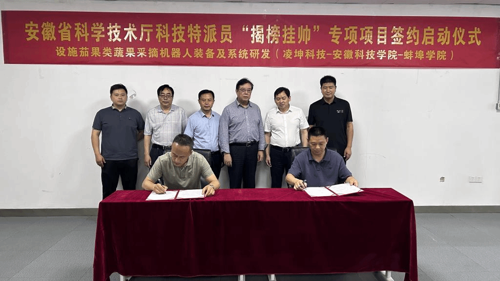 安徽省科学技术厅科技特派员“揭榜挂帅”农业物质技术装备专项项目,属于安徽省科技重大专项项目,我校机械工程学院材料成形及智能装备团队申报的“设施茄果类蔬果智能采摘机器人装备及系统研发”获批立项,这也是BB手机官方网站_BB(中国)首次获批省级揭榜挂帅项目;该项目省级支持资金100万,地方按照1:1配套资金。6月2日,发榜方和揭榜方在安徽凌坤智能科技有限公司举行项目启动和各方责任履约签约仪式,蚌埠市科技局副局长杨怀波、BB手机官方网站_BB(中国)科研处处长陈丰、安徽凌坤智能科技有限公司董事长潘成刚等参加签约启动仪式。