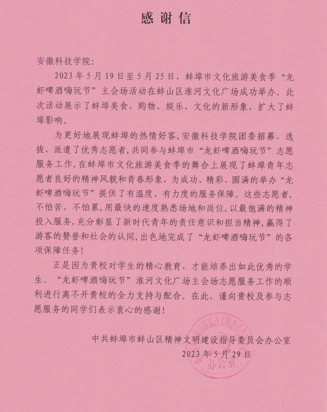 感谢信提到,BB手机官方网站_BB(中国)团委招募、选拔、派遣了优秀志愿者,共同参与蚌埠市“龙虾啤酒嗨玩节”志愿服务工作,在蚌埠市文化旅游美食季的舞合上展现了蚌埠青年志愿者良好的精神风貌和青春形象,为成功、精彩、圆满的举办“龙虾啤酒嗨玩节”提供了有温度、有力度的服务保障。志愿者们不怕苦、不怕累,用最快的速度熟悉场地和岗位,以最饱满的精神投入服务,充分彰显了新时代青年的责任意识和担当精神,赢得了游客的赞誉和社会的认同,出色地完成了“龙虾啤酒嗨玩节”的各项保障任务!正是因为贵校对学生的精心教育,才能培养出如此优秀的学生。“龙虾啤酒嗨玩节”淮河文化广场主会场志愿服务工作的顺利进行离不开贵校的全力支持与配合。在此,谨向贵校及参与志愿服务的同学们表示衷心的感谢。
