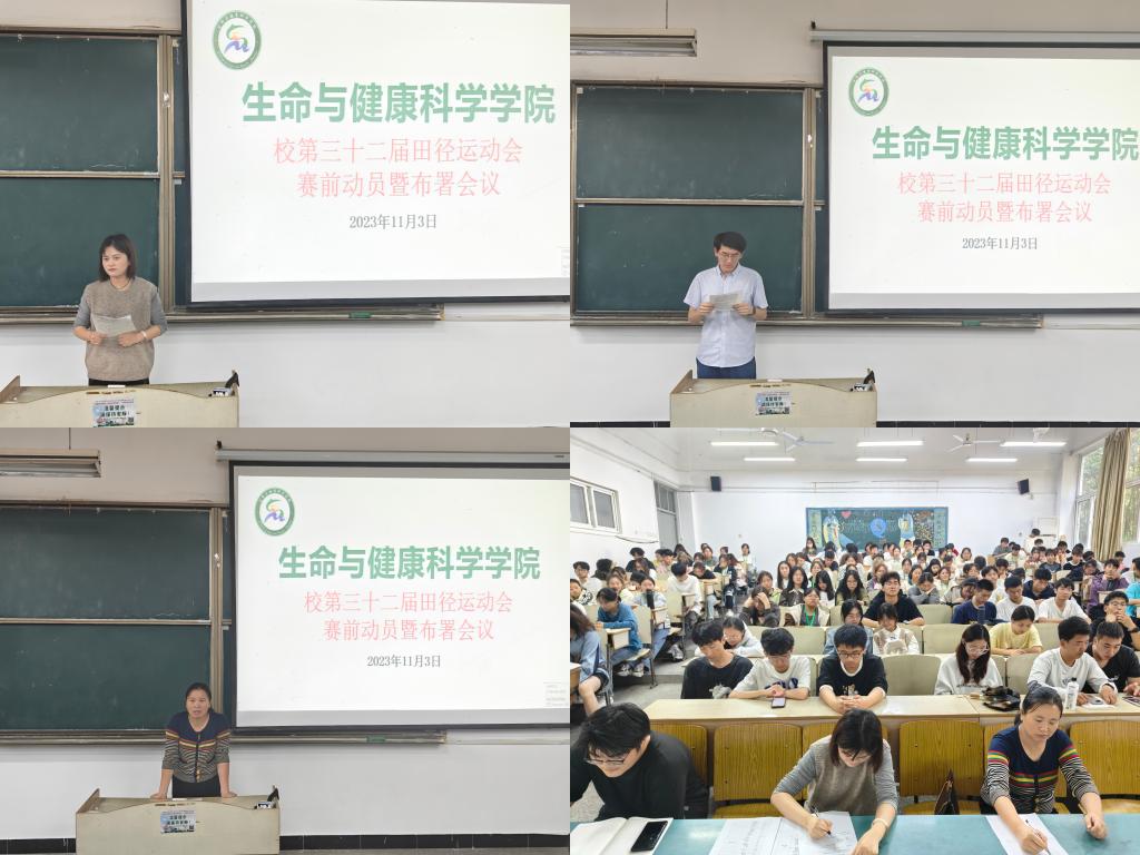 为保障校第三十二届运动会顺利举办,11月3日中午,生命与健康科学学院在求知楼A101教室召开校第三十二届田径运动会赛前动员暨部署会议。学院党政领导和有关教师出席本次会议,各班级体育委员(文体委员)、学院参赛运动员以及学生会全体成员参加。本次会议由专职辅导员沈靓主持。