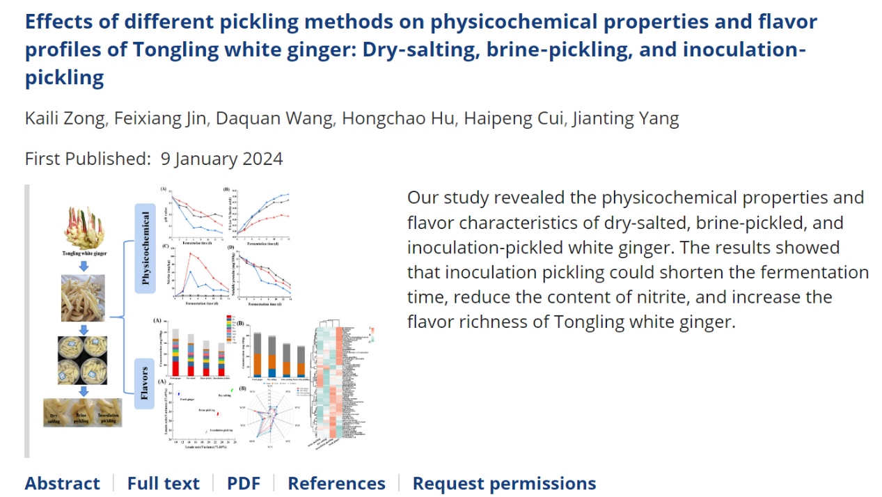 1月9日,我校果蔬精深加工与营养控制创新团队在农林科学领域二区期刊Food Science & Nutrition(IF=3.90)在线发表题为“Effects of different pickling methods on physicochemical properties and flavor profiles of Tongling white ginger: Dry‐salting, brine‐pickling, and inoculation‐pickling”的研究论文。我校食品工程学院2021级食品加工与安全领域研究生纵凯莉为第一作者,杨剑婷副教授为通讯作者,BB手机官方网站_BB(中国)为唯一完成单位。