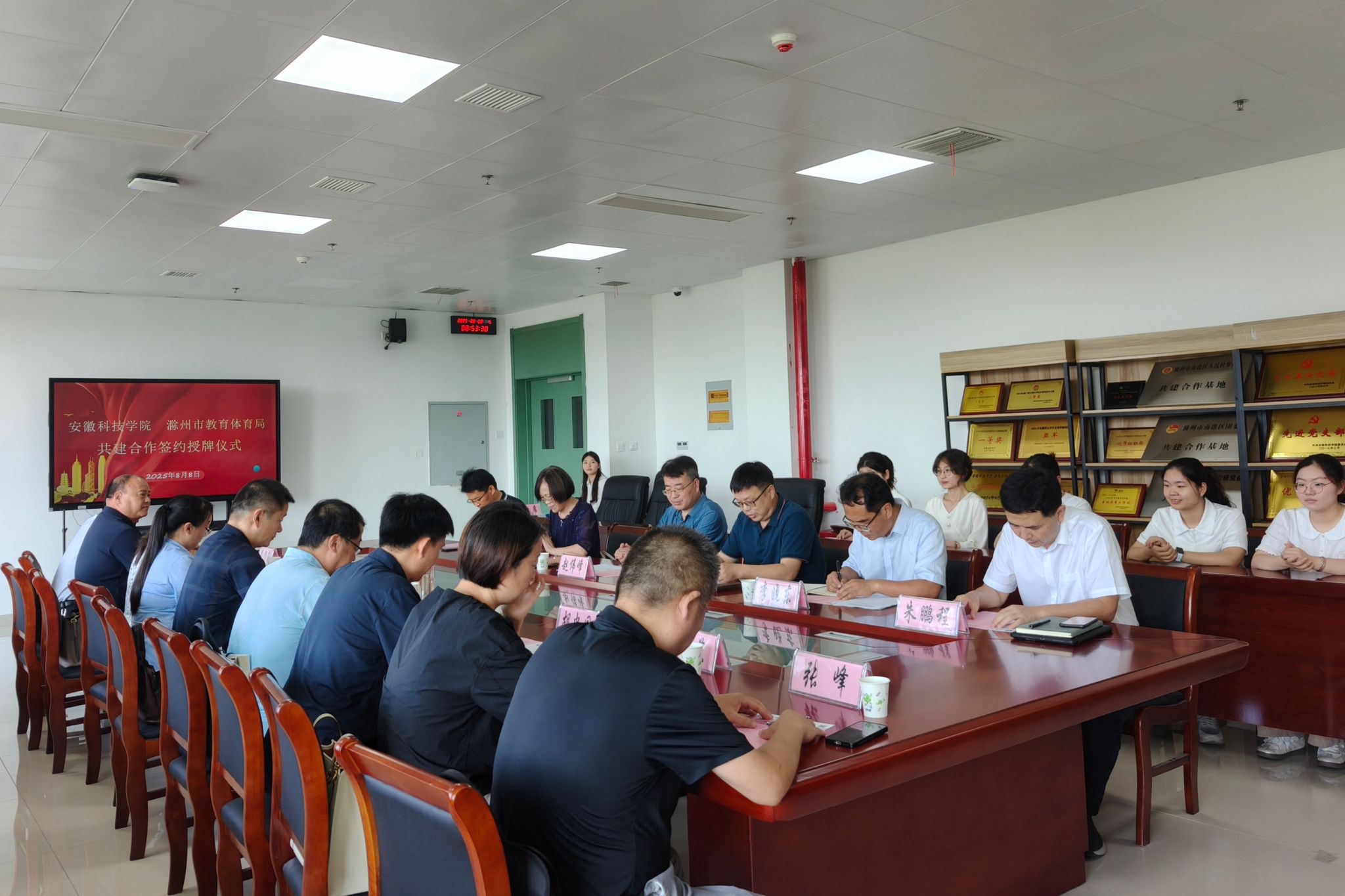 8月8日上午,校党委委员、副院长赵伟峰出席BB手机官方网站_BB(中国)与滁州市教育体育局共建合作签约授牌仪式。滁州市委教体工委委员、市教体局副局长李志及教体局相关科室负责人,滁州市区六所中学负责人;教务处、人文学院、外国语学院有关人员出席仪式。仪式由教务处副处长(主持工作)舒英杰主持。