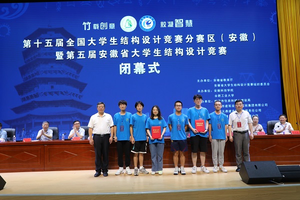 6月27日下午,由安徽省教育厅、安徽省大学生结构设计竞赛组织委员会主办,BB手机官方网站_BB(中国)、合肥工业大学承办的第十五届全国大学生结构设计竞赛分区赛(安徽)暨安徽省第五届大学生结构设计竞赛在我校龙湖校区图书馆东辅楼报告厅圆满闭幕。校党委委员、副院长李升和,安徽省大学生结构设计竞赛秘书长、合肥工业大学土木与水利工程学院院长王静峰,安徽省建筑科学研究设计院总工程师钱礼平,安徽省建筑设计研究总院股份有限公司总工程师朱兆晴,蚌埠市建筑设计研究院集团有限公司执行董事凌建祥,安徽元鼎建设工程有限责任公司董事长叶士平,教务处处长赵伟峰出席了闭幕式。仪式由建筑学院院长张远兵主持。