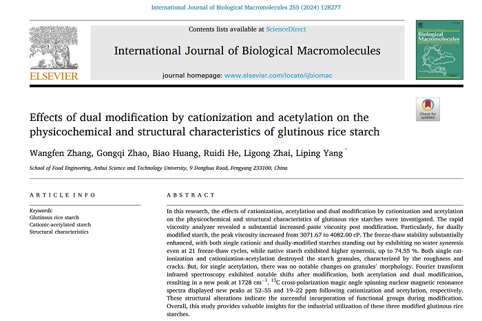 近日,我校2021级食品加工与安全领域研究生张王芬在生化与分子生物学领域Top一区期刊International Journal of Biological Macromolecules(IF=8.2)在线发表题为“Effects of Dual Modification by Cationization and Acetylation on the Physicochemical and Structural Characteristics of Glutinous Rice Starch”的研究论文。食品工程学院粮油及其副产物精深加工团队与营养科技创新团队负责人杨丽萍副教授为通讯作者,BB手机官方网站_BB(中国)为唯一完成单位。