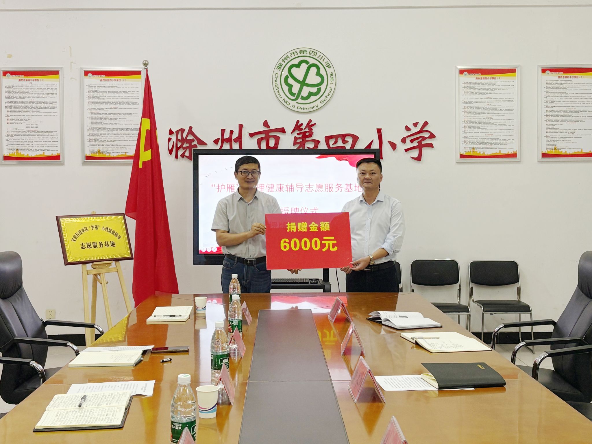 仪式现场,李刚与徐迟共同为滁州市第四小学“‘护雁’心理健康辅导志愿服务基地”授牌,李刚代表学校团委向基地捐赠由青年志愿者通过回收废旧纸箱筹集的6000元资金。