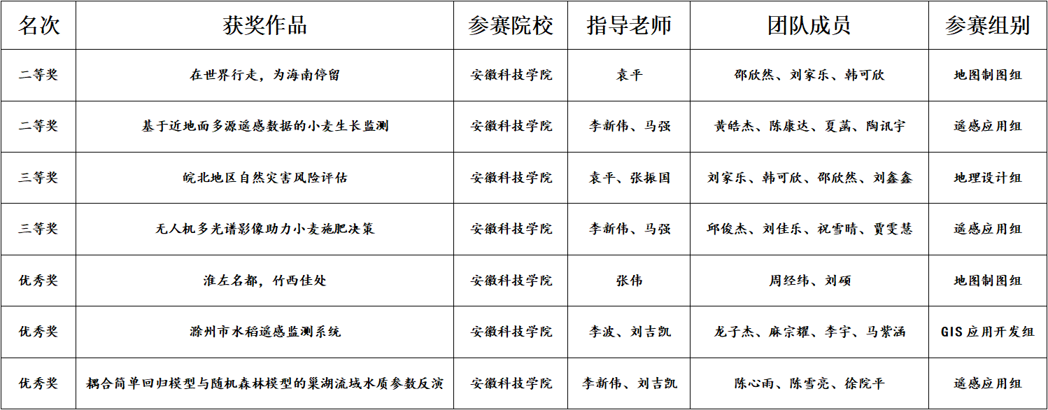 8月25日,安徽省第十三届大学生GIS技能大赛暨长三角空间信息技术大赛圆满落幕。本次大赛共有来自长三角地区13所高校的133支队伍参与。大赛以线上的方式举行,评委线下评审的方式进行。比赛中,我校参赛学生充分发挥自己的实力,最终获得共获得A组地图制图组二等奖一项、优秀奖一项,B组地理设计组三等奖一项,D组GIS应用开发组优秀奖一项,E组遥感应用组二等奖一项、三等奖一项、优秀奖一项,共计二等奖两项、三等奖两项、优秀奖三项的好成绩。