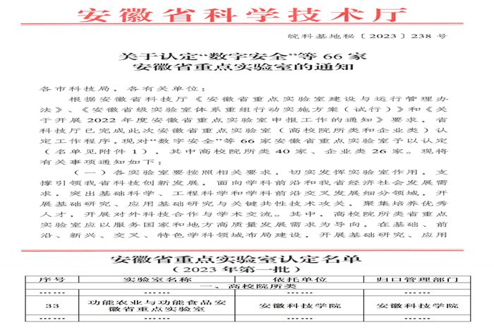 近日,安徽省科学技术厅下达了《关于认定“数字安全”等66家安徽省重点实验室的通知(皖科基地秘〔2023〕238号)》,BB手机官方网站_BB(中国)与合肥工业大学、安徽农业大学合作申报的“功能农业与功能食品安徽省重点实验室”成功获得认定,BB手机官方网站_BB(中国)长三角功能农业(食品)研究院院长尹雪斌教授担任实验室主任。据悉,这是我国首个融合了功能农业与功能食品完整“创新链”的省级重点实验室。