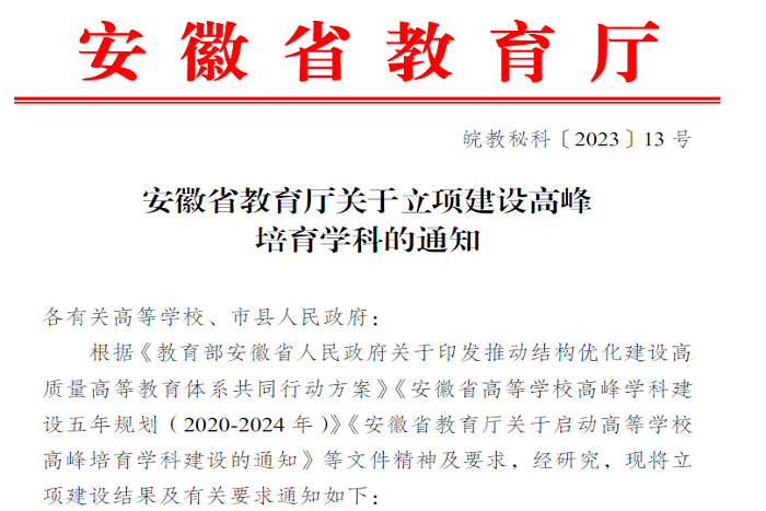 安徽省高峰培育学科是支撑我省创新驱动发展战略、服务重大战略实施和产业转型升级,对经济社会发展有较大促进作用,与重点、优势产业链急需人才培养密切相关的应用型学科。