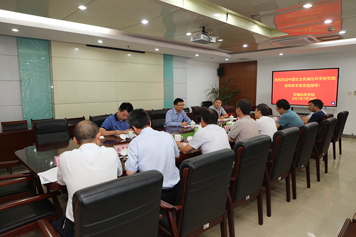 2021年7月27日至28日,中国农业机械化科学研究院副院长苑严伟,率党委组织部副部长、研究生院招生与就业办公室主任刘涛和战略运营部产业经营办公室主任刘铎,应邀来我校考察指导工作、洽谈合作交流项目。党委书记蒋德勤,党委副书记、校长李震,党委委员、副校长黄友锐,党委研究生工作部部长、研究生处处长张春雨,科研处副处长张从宇,机械工程学院党委书记、院长陈丰,组织员张严政,副院长乔印虎参加洽谈交流会。