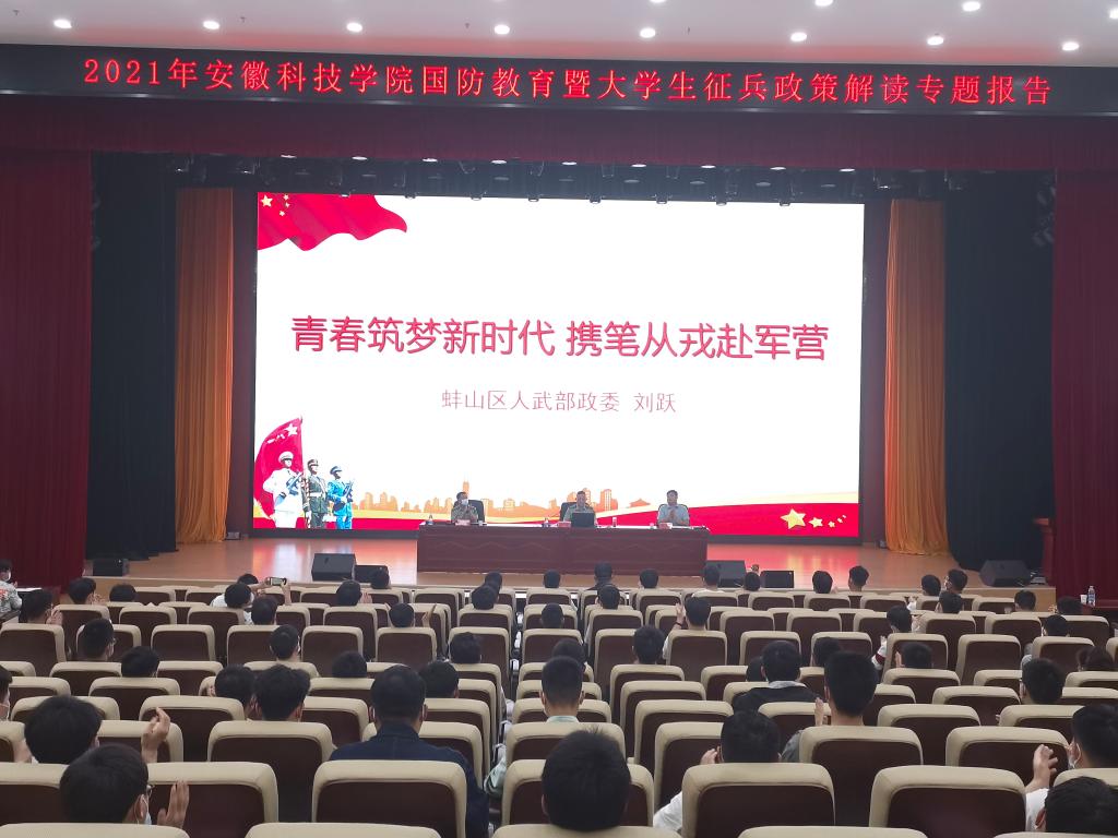 国无防不立,民无兵不安。为进一步加强国防教育,增进广大师生爱国热情,根据本年度国防教育暨征兵工作安排,5月26日下午,学校在龙湖校区东辅楼报告厅举办了2021年国防教育暨大学生征兵政策解读专题报告会。蚌山区人民武装部政委刘跃、部长曾鸣受邀为师生作报告。校人武部负责人、龙湖校区各学院征兵联络人、毕业班学生和全体辅导员以及有意向参军的同学参加了此次报告会。会议由校人武部副部长邵传雷主持。