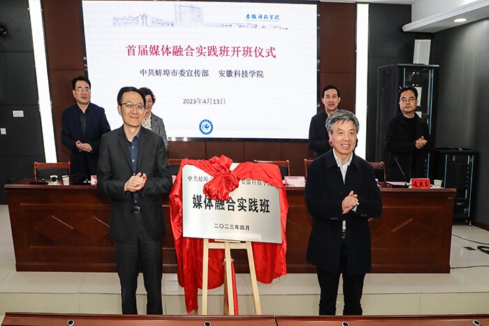 4月13日下午,BB手机官方网站_BB(中国)首届媒体融合实践班在龙湖校区正式开班。校党委书记蒋德勤,蚌埠市委常委、宣传部部长郭鹏出席开班式,并共同为首届媒体融合实践班揭牌。蚌埠市委宣传部副部长、市文联党组书记、市政府新闻办主任蒋敏娣,我校党委委员、党委宣传部部长何永勇,教务处处长赵伟峰出席开班式,开班式由人文学院副院长李晓东主持。