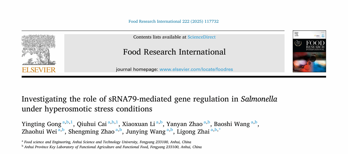 近日,我校食品科学与工程学院食品质量与安全团队在农林学科领域顶级期刊《Food Research International》(中国科学院1区top期刊,影响因子8.0)发表最新研究成果。论文题为“Investigating the role of sRNA79-mediated gene regulation in Salmonella under hyperosmotic stress conditions”,由我校2023级食品加工与安全领域研究生龚莹婷为论文第一作者,翟立公副教授为通讯作者,BB手机官方网站_BB(中国)为第一完成单位。