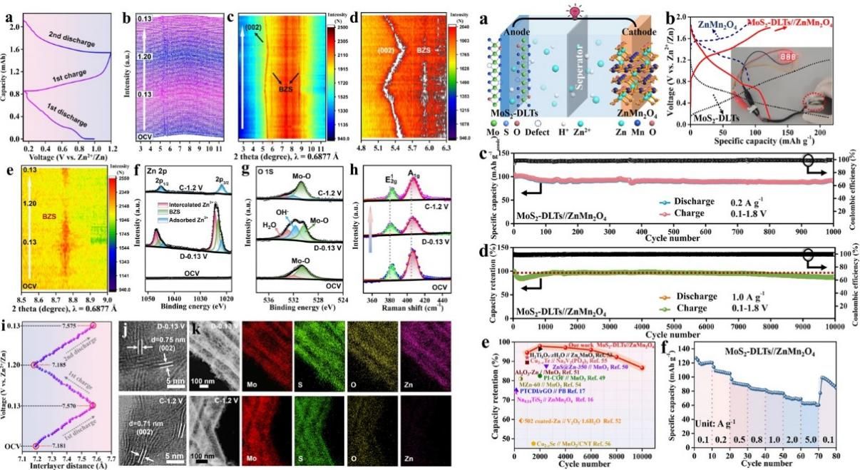 水系锌离子电池因其低成本和高安全性而受到广泛关注,但锌金属负极的枝晶生长、低镀/剥效率、表面钝化和自腐蚀等问题阻碍了其应用。本文提出了一种一步原位分子工程策略,用于同时构建具有扩大的层间距、氧掺杂、结构缺陷和丰富的1T相的分级MoS2双层纳米管(MoS2-DLTs),显示出优异的循环寿命,组装的MoS2-DLTs//ZnMn2O4全电池表现出令人印象深刻的循环稳定性,优于大多数报道的“摇椅式”AZIBs。本工作还通过同步辐射原位粉末X射线衍射和多重离位表征技术研究了MoS2-DLTs的Zn2+/H+共插层储能机理,成功证实了二硫化钼作为插层式锌存储负极的可行性,对二维材料的设计和水系全电池的构建具有重要的借鉴和指导意义。(特约通讯员:薛璐莎 审核:张炎 编辑:李锦)