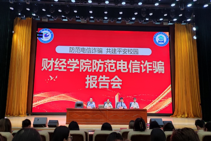 为提高师生防范电信网络诈骗意识,引导师生树立理性消费观,营造浓厚校园防诈反诈氛围,5月29日下午,财经学院联合蚌埠市龙子湖分局反诈中队、邮政储蓄银行蚌埠分行共同举办了金融知识进校园反诈宣传主题活动。财经学院党委副书记耿广汉主持,2023级和2022级全体学生参加。
