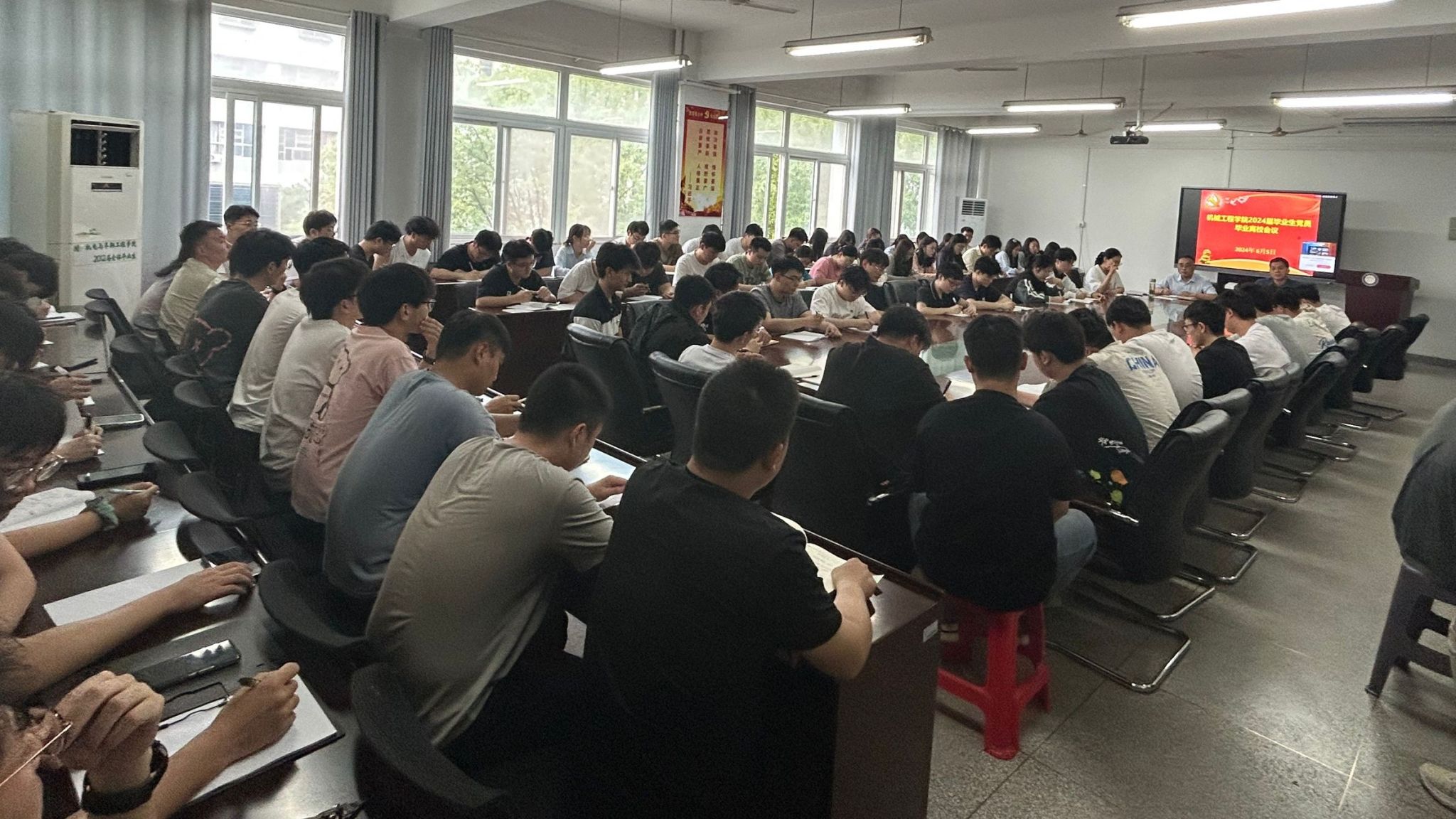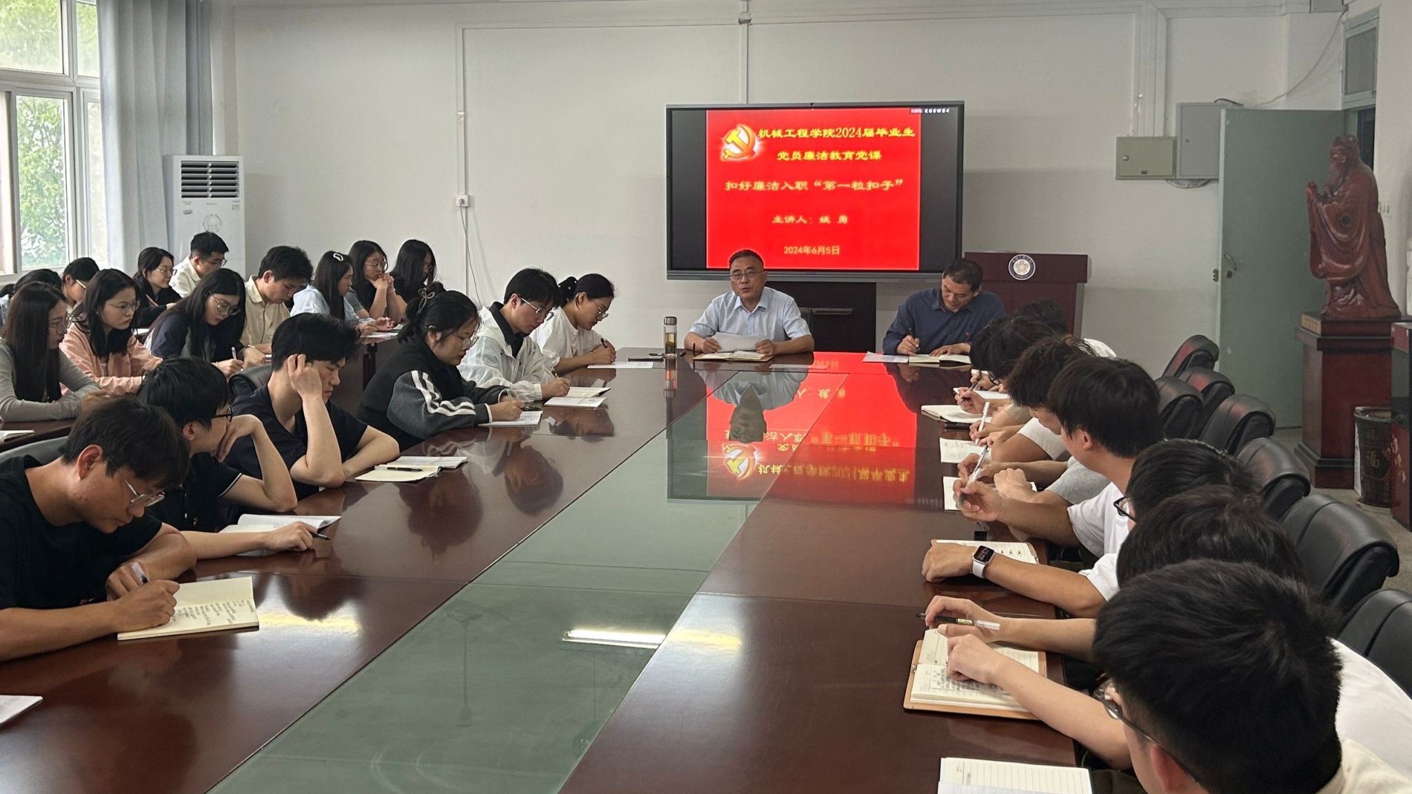 为推动党纪学习教育走深走实,夯实清正廉洁思想根基,切实做好2024届毕业生毕业教育和离校工作,6月5日下午,机械工程学院在会议室召开全体2024届毕业生党员会议,开展廉洁教育、布置毕业离校等工作。学院党委书记姚勇出席并为全体毕业生党员讲授廉洁教育党课,全体2024届毕业生党员参加会议并聆听党课。