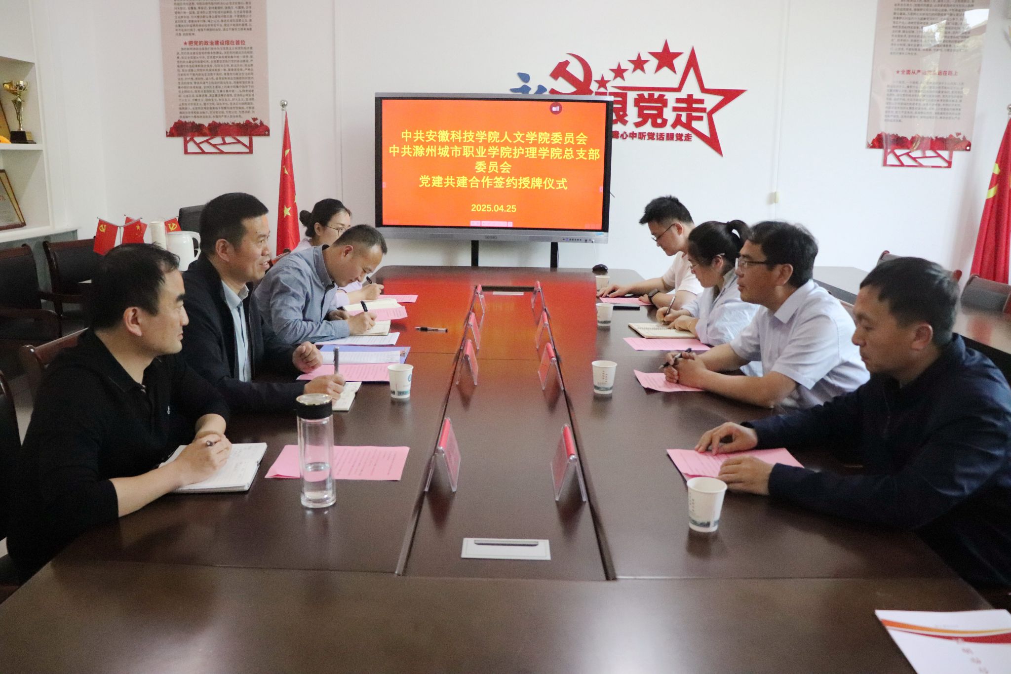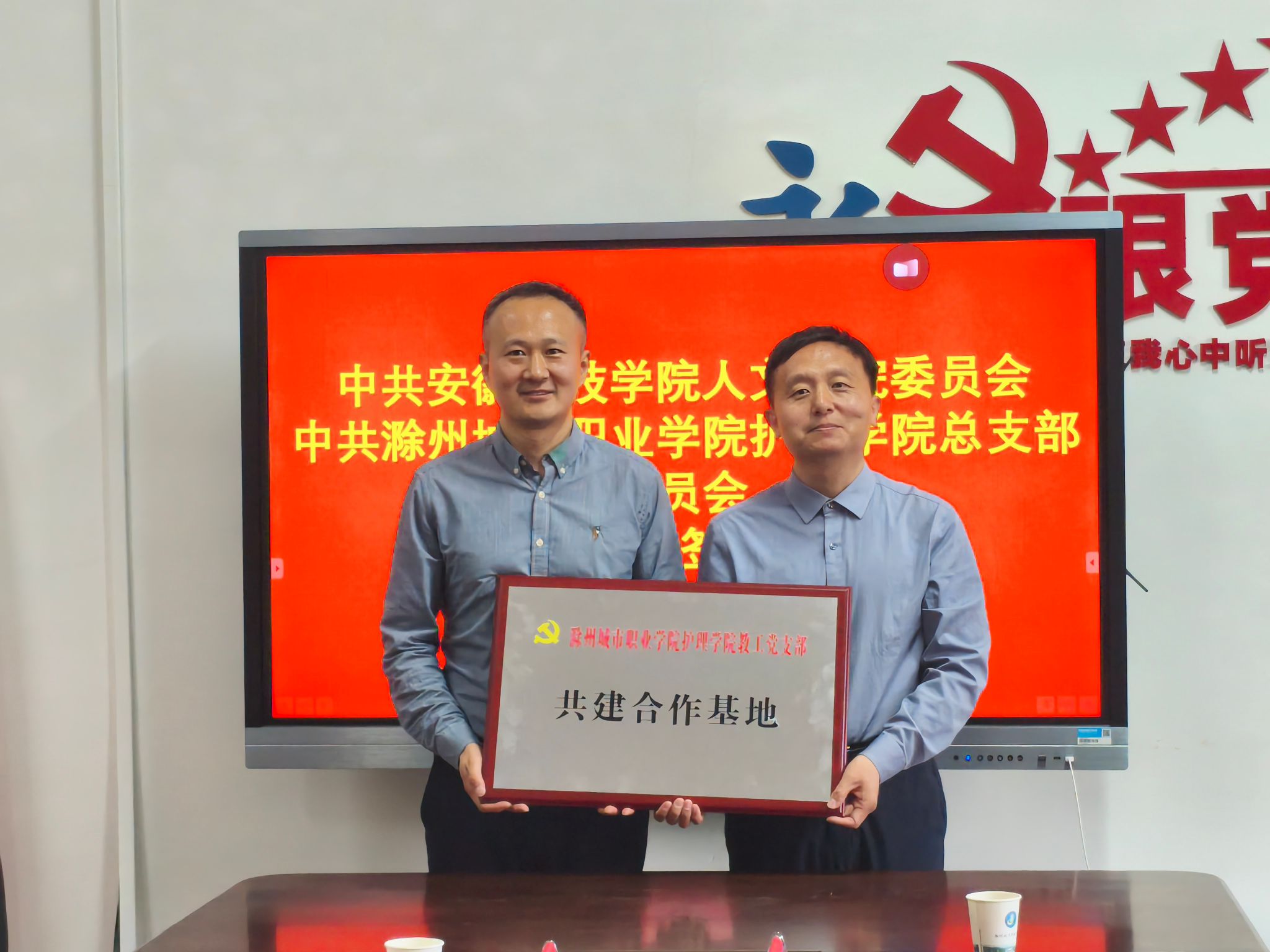 4月25日下午,人文学院党委书记、院长李晓东一行4人赴滁州城市职业学院护理学院,参加党建共建合作签约授牌仪式。仪式由滁州城市职业学院护理学院教工党支部书记、副院长李勋华主持,双方围绕党建共建目标推进合作事宜。
