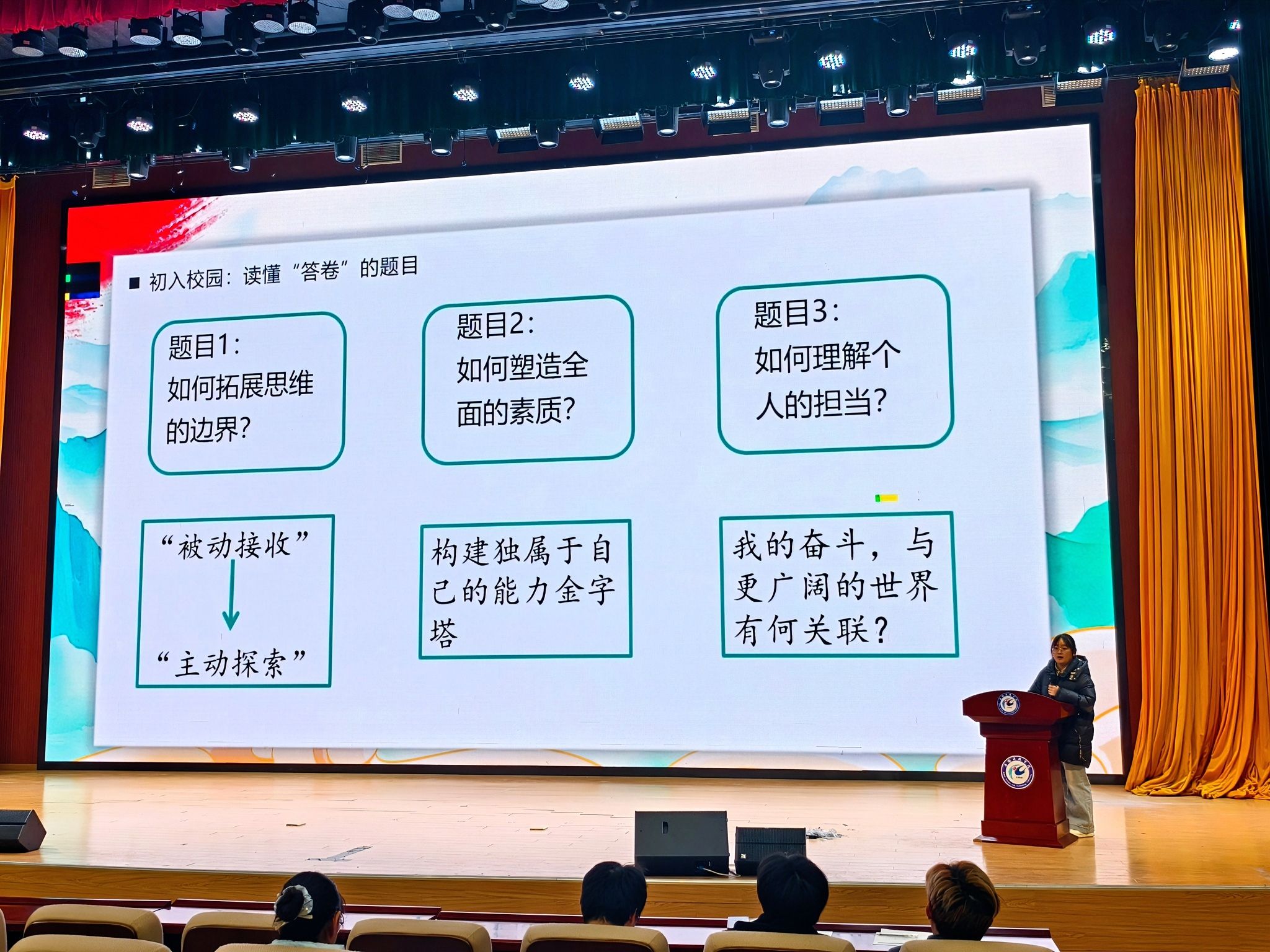 任雨荷结合自身两年来的大学成长经历,以轻松亲切的语气,围绕青年成长与责任担当展开分享,为在场学子答疑解惑。她谈到,大学是开放命题的成长赛场,青年需主动打破思维边界、丰富素质维度、扛起责任担当,在实践中积累成长动能。同时,任雨荷结合乡村振兴、科技自强、文化自信等时代命题,点明建筑专业青年的时代责任,阐释积极分子身份背后的担当,引导青年从“旁观者”转变为“参与者”,在服务社会中实现青春价值。