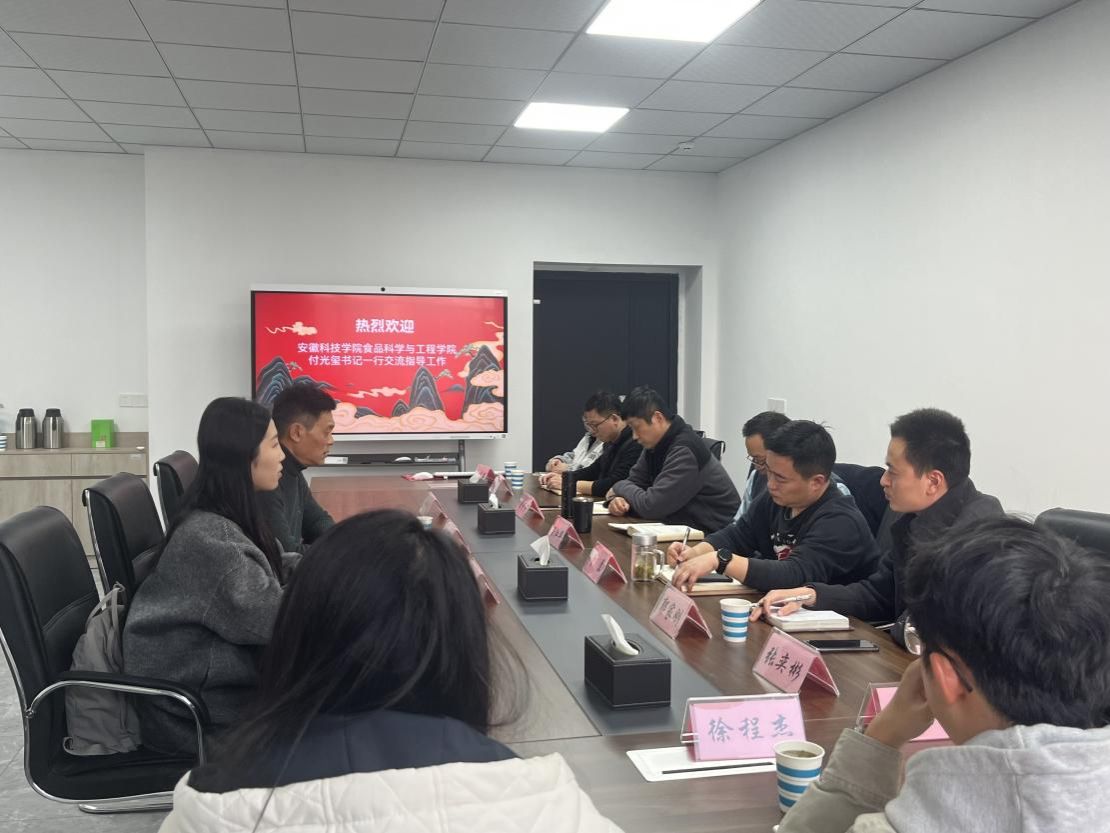 为切实关爱联合培养研究生成长,深化与联培单位的协同育人机制,11月 21日下午,食品科学与工程学院党委书记付光玺一行赴安徽省农业科学院 ,走访看望联合培养的研究生,并就人才培养、科研合作等议题进行深入交流 。 安徽省农科院加工所副所长程江华主持会议, 研究员谢宁宁 、 副研究员曹磊 、 助理研究员郭家刚出席会议。