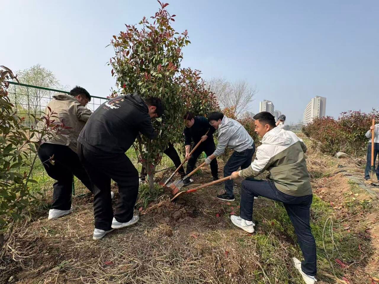 在老师们的指导下,同学们迅速分组、分工,挖坑、起苗、填土、浇灌、固定,每一个环节一丝不苟、配合默契。老师与同学们并肩劳作,现场教授园林植物栽培技巧,细致讲解红叶石楠的生长习性、养护要点等。在师生同心协力下,原本空旷的实践基地里,33棵红叶石楠整齐挺立、迎风展姿,为校园增添了一抹盎然春意,也承载着师生们对生态校园建设的美好期许。