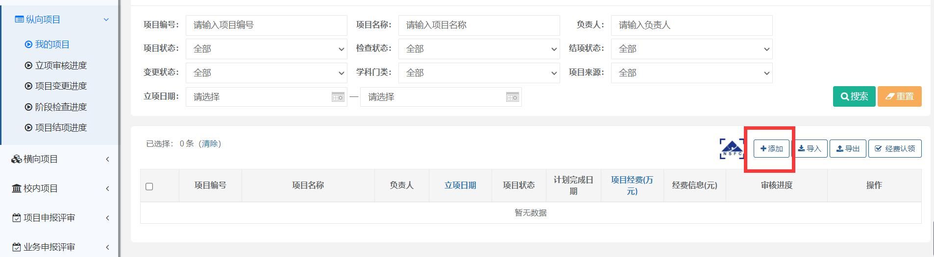 进入“科研系统-“我的空间”右侧栏目提供相关业务办理路径,可直接点击进入,点击“添加”办理有关业务。