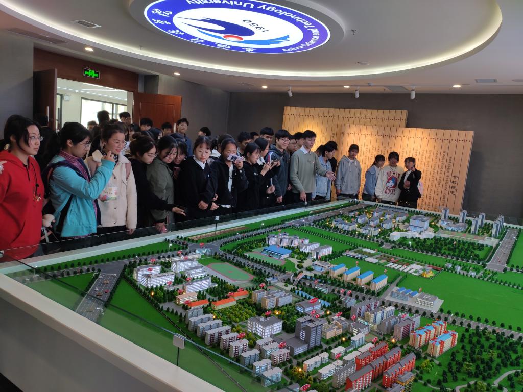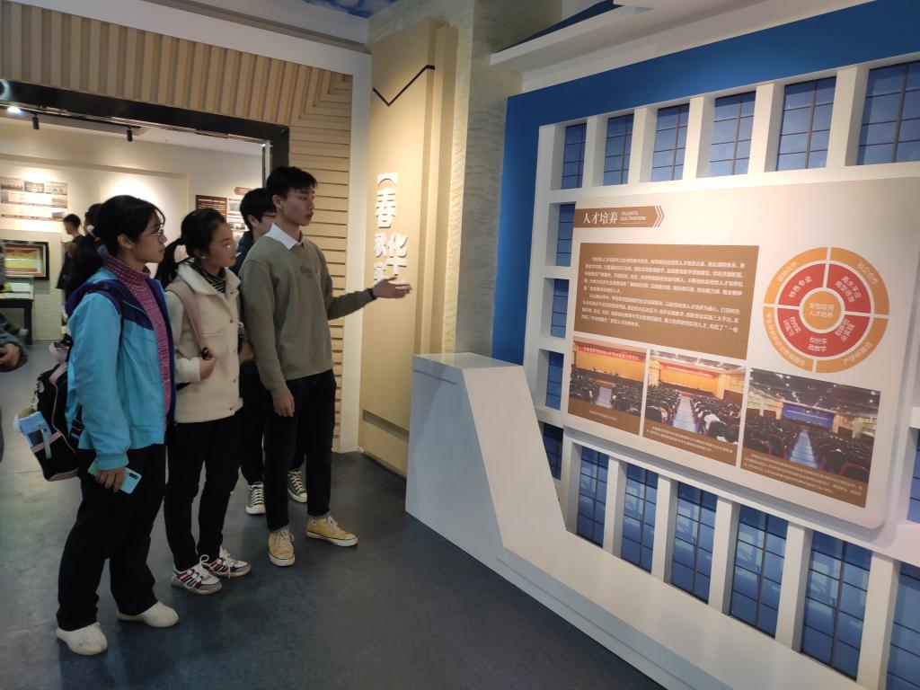 在美丽的校园全景沙盘模型旁,同学们兴奋地找寻教学楼、宿舍楼、操场以及日常活动场所;在校友的先进事迹报道原件前,各种表彰奖励的证书、奖牌、奖章及奖杯,激励着同学们砥砺奋进;在“手绘校园”师生书画展区,熟悉的校园一角在画纸上充分展现,作画者皆来自身边的老师和学长学姐,同学们纷纷投来羡慕的眼神。