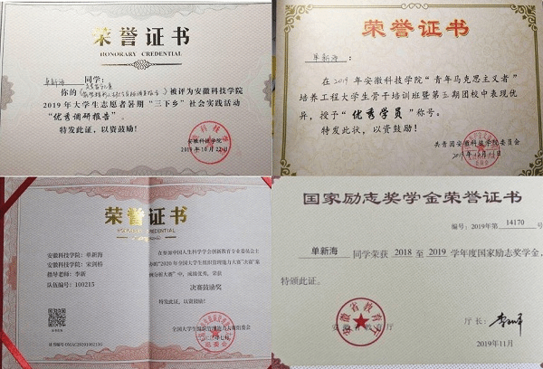作为新时代的青年学子,单新海力求德智体美劳全面发展,大学入学至今共获得国家级奖项5项,省级奖项4项,校级奖项30项,院级奖项28项。2018年参加安徽省蚌埠市体育局招募的“言鼎华创”杯2018年全国青年游泳锦标赛志愿者工作,获得国家级志愿者荣誉称号。在2019年BB手机官方网站_BB(中国)第五期青年马克思主义者培训中,单新海表现优异,作为优秀学员代表上台发言,并被安科小团、安徽青年大学生网等多方媒体报道。自新冠肺炎疫情发生以来,单新海积极响应学校以及学院的号召,为坚决打赢疫情防控的人民战争、总体战、阻击战奉献青春力量,获评“BB手机官方网站_BB(中国)抗疫学生先进个人”荣誉称号。此外,单新海还就新冠疫情开展云调研,近万字的调研报告《蔚来智能崛起的一波三折—基于蔚来公司的社会调研与案例分析》不仅让整个团队实践效果突出,同时也获2020年全国大学生组织管理能力大赛决赛奖项,并收到主办方致蔚来的推荐信。单新海基于新冠疫情申报的大学生创新创业训练项目更是获得国家级立项,相关事迹被安科小团公众号、BB手机官方网站_BB(中国)校园网报道。2020年9月,单新海被学校推选参加省级三下乡优秀实践个人、省级三下乡优秀调研报告的评选活动。