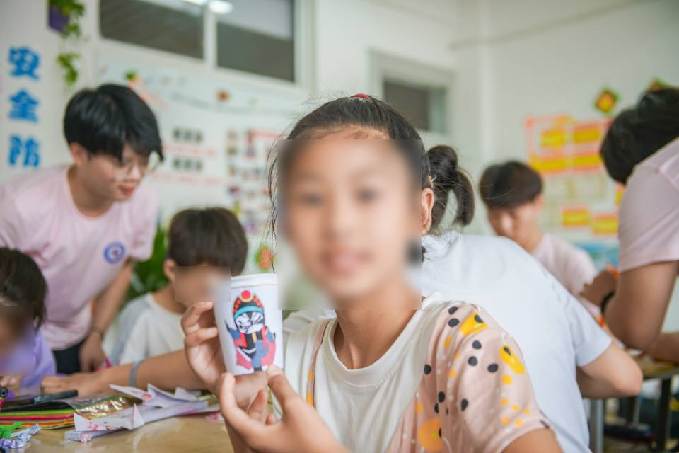神奇的变脸玩具吸引了孩子们的目光,团队成员黄苏琳通过变脸文化演示文稿讲述变脸传统文化,激发孩子们对变脸艺术的兴趣,面对大屏幕上从未见过的变脸艺术,纷纷惊叹不已。在他们对变脸玩具跃跃欲试的时候,团队成员黄苏琳像玩魔术一般,将自制的变脸纸杯半成品展现在大家面前,孩子们需要做的是开动脑筋,自己绘制变脸纸杯中的多样表情。孩子们认真思考、投入其中,不时模仿着自己绘制的搞怪可爱的表情,并与作品来个合影。