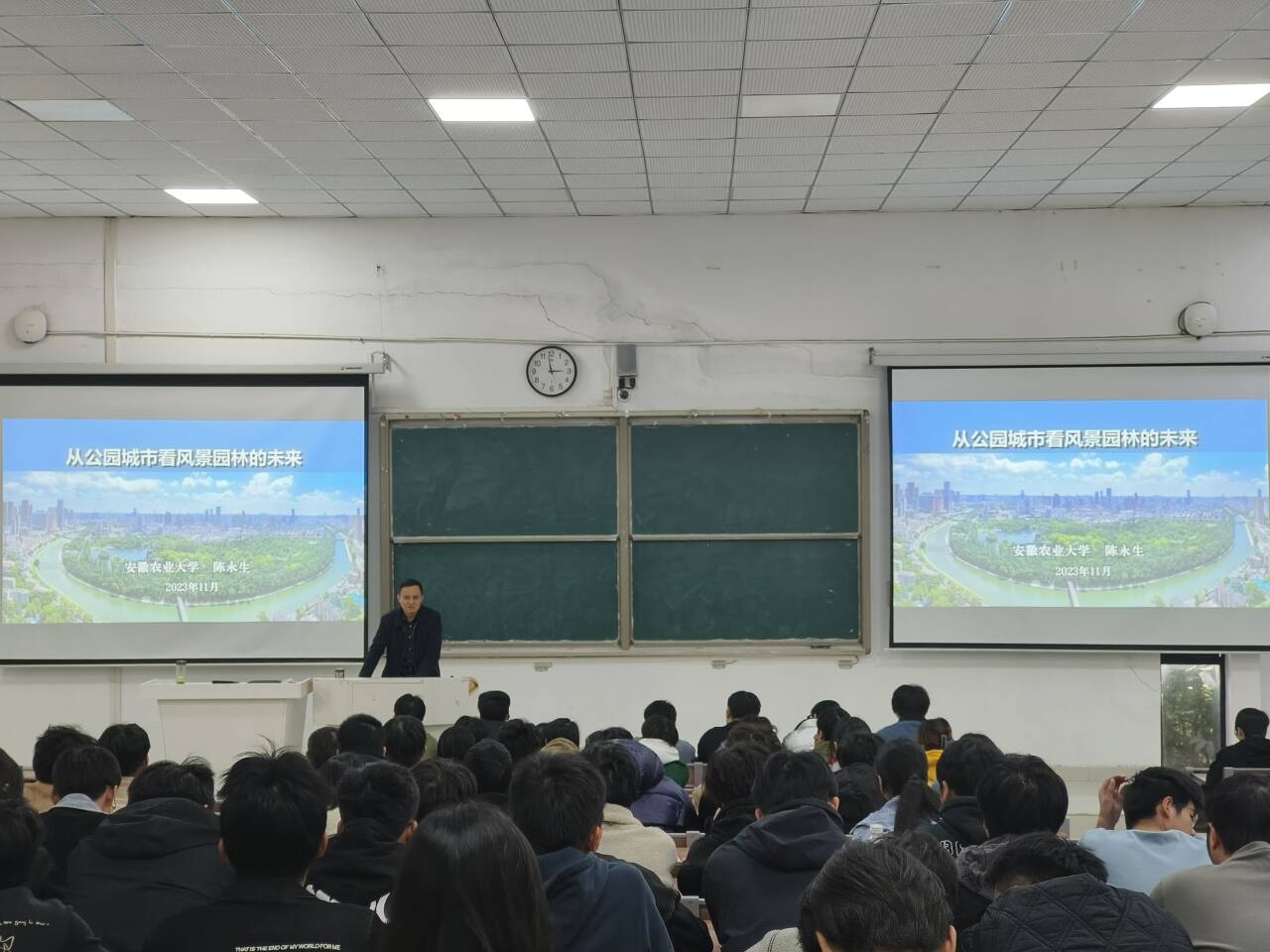 11月22日下午,安徽农业大学风景园林系主任、国家一流园林专业建设负责人,安徽省风景园林学会副理事长,教育部科技成果评审首聘专家陈永生教授在BB手机官方网站_BB(中国)龙湖校区致知楼C111为我校师生作题为“从公园城市看风景园林的未来”的学术报告。报告由建筑学院风景园林系主任王雪娟主持。