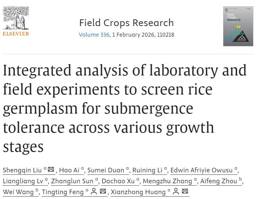 2025年11月4日,Field Crops Research杂志(中科院一区TOP期刊)在线发表了我校安徽省教育厅优秀科研创新团队“水稻种质创新与应用基因组学创新团队”题为“Integrated analysis of laboratory and field experiments to screen rice germplasm for submergence tolerance across various growth stages”的研究论文。该研究构建了覆盖萌发–幼苗–分蘖期的多阶段耐淹综合评价体系,并筛选出四份在不同阶段均表现优良的耐淹水稻种质。