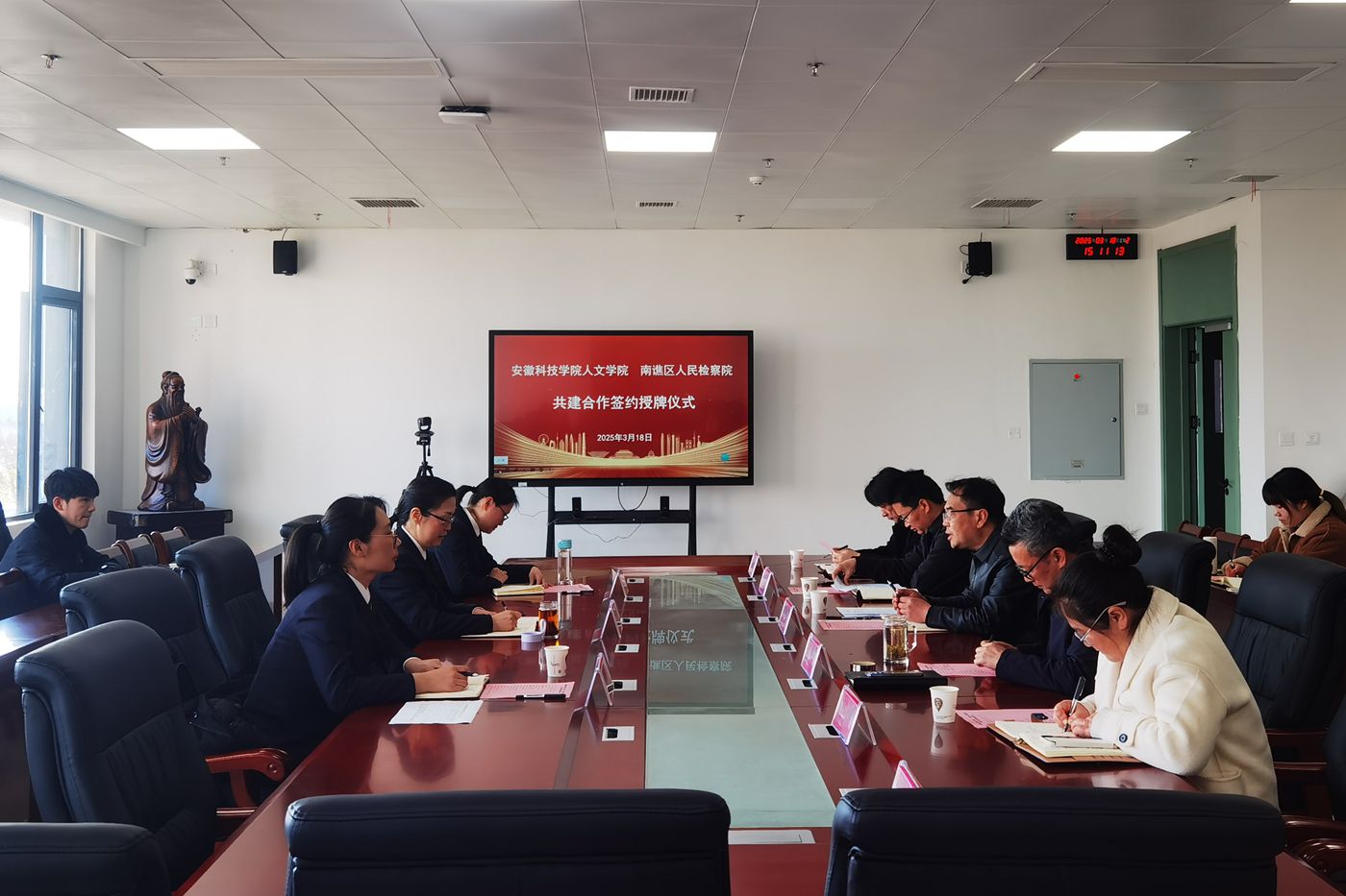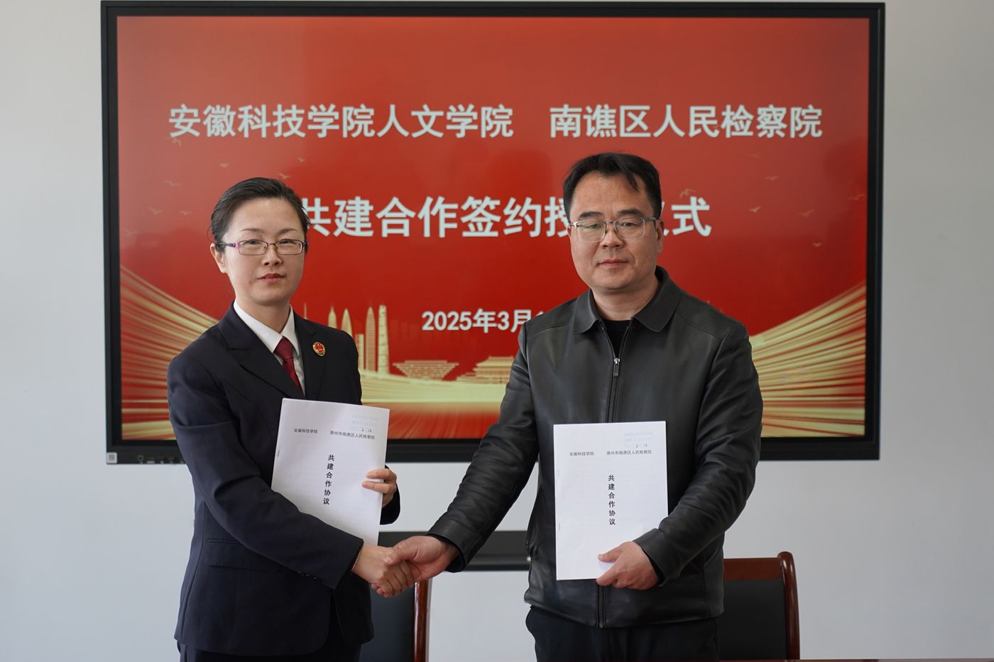 为加强法学专业实习实训基地建设,推动法学专业新文科认证,搭建人才培养单位与法律实务部门交流平台,3月18日下午,人文学院与滁州市南谯区人民检察院举行共建合作签约授牌仪式。南谯区人民检察院党组书记、检察长陈涛和副检察长钱佳、第一检察部主任张婷婷,学院党委副书记、院长李晓东和正处级组织员张严政、副院长牛永辉、党委副书记李沙娜、党委委员骆绪刚、模拟法庭主任宣刚出席,仪式由张严政主持。