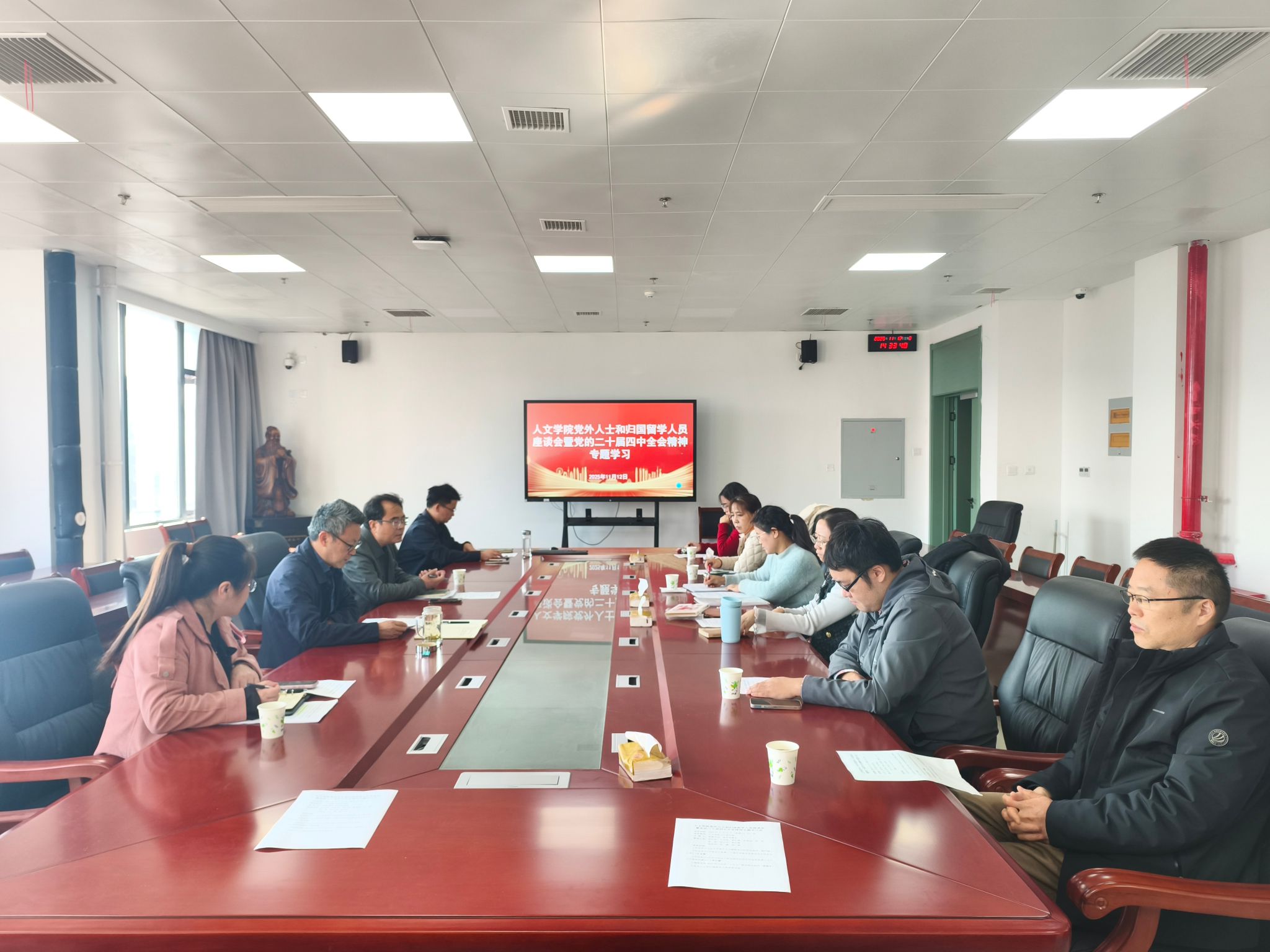 为深入学习贯彻党的二十届四中全会精神,推动“创新发展·安科在行动”主题实践活动和“双树双建”主题教育活动走深走实,团结凝聚党外知识分子和归国留学人员力量,推动学院各项事业高质量发展,11月12日下午,人文学院召开党外人士和归国留学人员座谈会暨党的二十届四中全会精神专题学习会。学院党政领导、党外人士代表和归国留学人员、教工党支部书记、党政办负责人参加,会议由学院党委书记、院长李晓东主持。