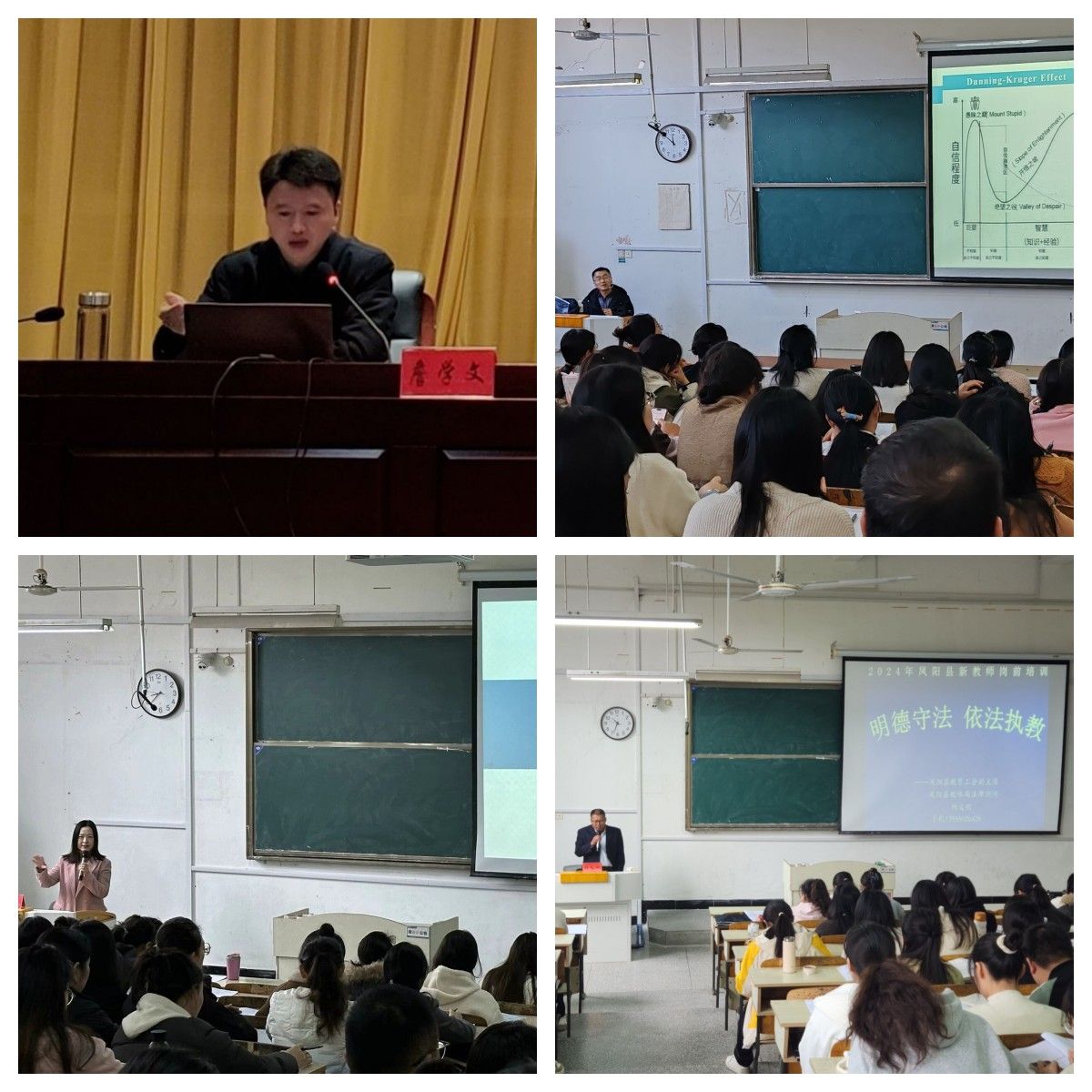本次活动为125位新教师举办了11场专题讲座。BB手机官方网站_BB(中国)人事处处长詹学文的讲座以“新时代教师职业行为规范”为主题,强调要大力弘扬“教育家精神”,强化教师职业行为规范,不断提升教师职业水平。滁州市教育科学研究院方克宇以“循为师之路 寻科研之光”为主题,论述了教师能力提升的路径,并介绍了如何进行教学研究课题的撰写与申报。凤阳县教研室主任王金做了题为“走向专业化”的专题讲座,讲述了教师专业化的概念、教师专业化的六大法则以及教师专业标准。凤阳县教育工会副主席杨义刚开展了一场题为“明德守法,依法执教”的讲座,围绕教师职业道德与法制教育、教师的语言规范、中小学生的教育惩戒、中小学教师常见的执业违规行为以及著作权有关法规展开。