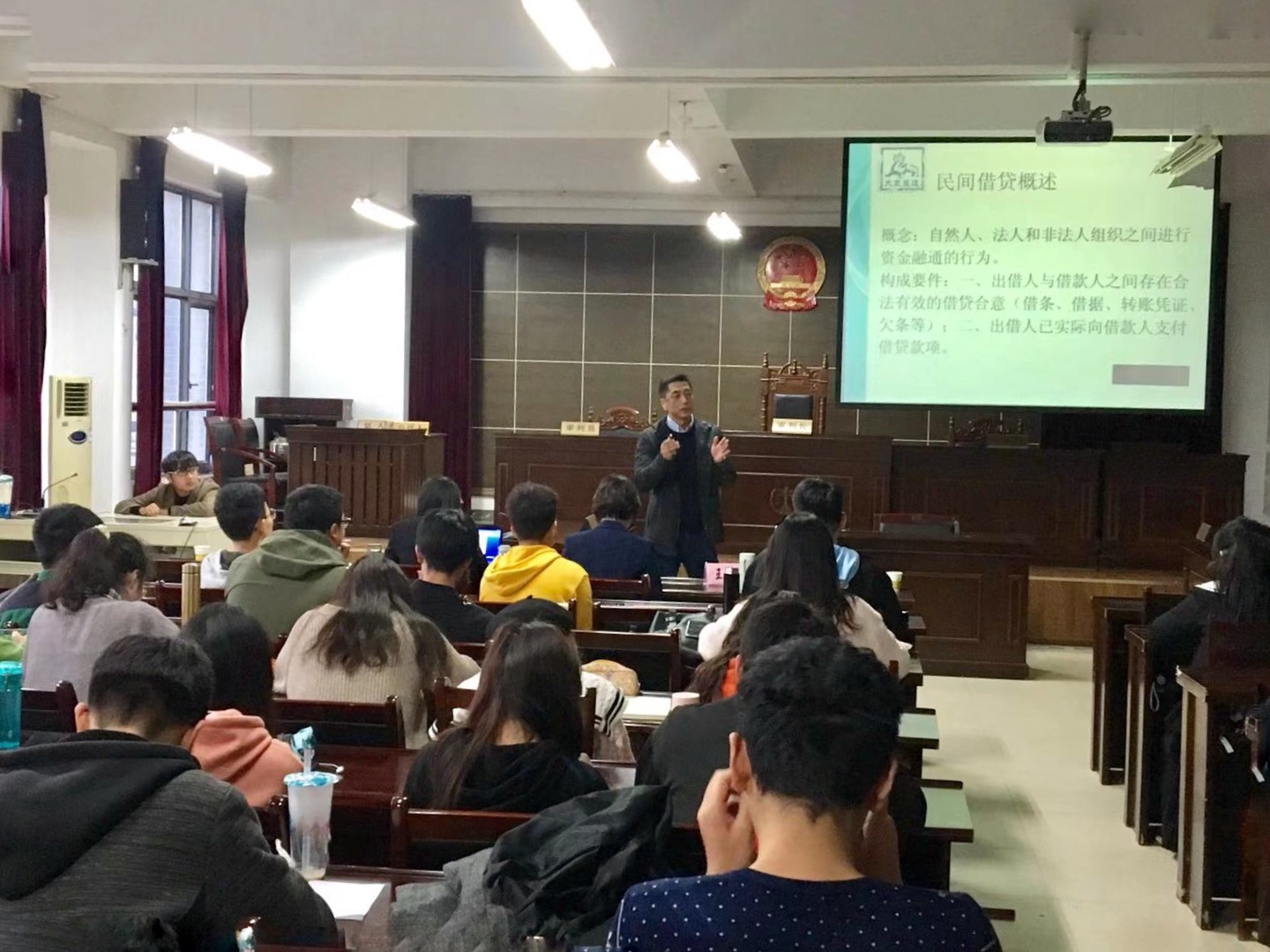11月17日下午,“知秋杯”第一届BB手机官方网站_BB(中国)法治论坛系列活动——“以案说法”在模拟法庭举办。安徽大友昱达律师事务所执行主任杨根宝作“民间借贷纠纷实例分析”主题报告。安徽大友昱达律师事务所律师王苏敏、安娟、黄娜、潘亮等受邀出席。活动由人文学院院长助理骆绪刚主持。