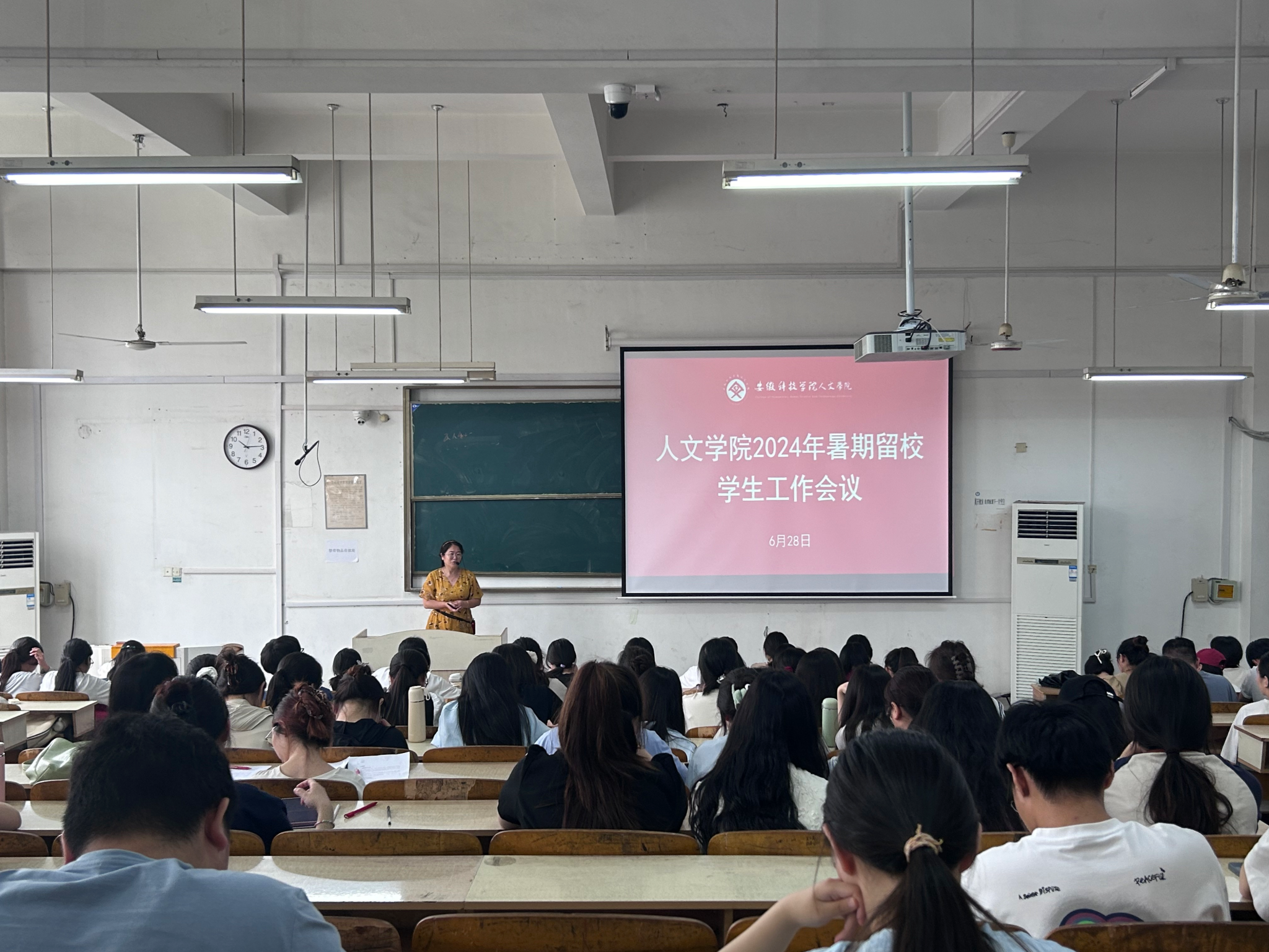 为加强暑期留校学生安全教育与日常管理,确保学生生命财产安全和校园秩序稳定,6月28日上午,人文学院在求知楼A204召开2024年暑期留校学生工作会议。学院党委副书记李沙娜、党政办公室副主任方明旺、副科级辅导员鲁冰冰及全体留校学生参加会议。会议由方明旺主持。