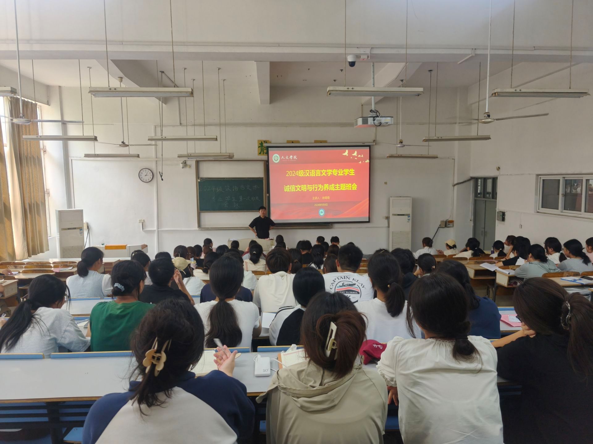 为加强2024级新生诚信文明教育,培养学生诚信品质,引导大家牢固树立诚信理念,养成“诚信待人、诚信处事、诚信学习、诚信立身”的良好习惯,近日,人文学院通过召开主题班会等形式,开展“诚信文明与行为养成”主题教育。