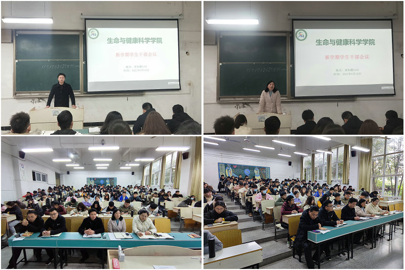 3月10日下午,生命与健康科学学院在求知楼A101教室召开新学期学生干部会议。学院党委书记詹学文,党委副书记彭丽萍,党政办公室主任王传林,正科级辅导员兼组织员邓艳萍以及专职辅导员姜毅、刘国祥出席会议,18、19、20级各班级班长、团支书、学习委员,分团委、学生会、易班副部以上成员参加本次会议。会议由彭丽萍主持。